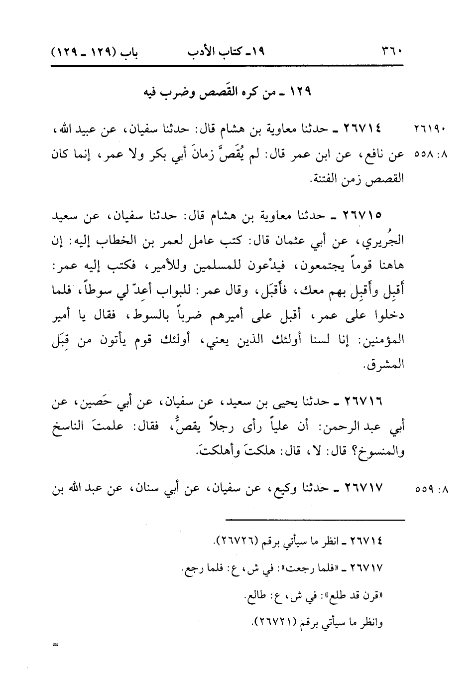 26716- حَدَّثَنَا يَحْيَى بْنُ سَعِيدٍ ، عَنْ سُفْيَانَ ، عَنْ أَبِي حَصِينٍ ، عَنْ أَبِي عَبْدِ الرَّحْمَنِ ، أَنَّ عَلِيًّا رَأَى رَجُلاً يَقُصُّ ، فقَالَ : عَلِمْت النَّاسِخَ وَالْمَنْسُوخَ ؟ قَالَ : لاَ قَالَ : هَلَكْت وَأَهْلَكْت. (8/558).