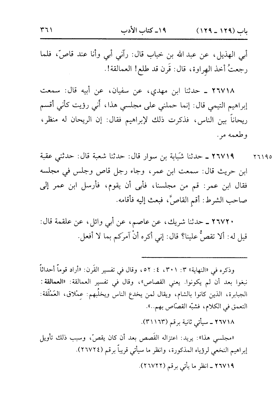 26720- حَدَّثَنَا شَرِيكٌ ، عَنْ عَاصِمٍ ، عَنْ أَبِي وَائِلٍ ، عَنْ عَلْقَمَةَ ، قَالَ : قيلَ لَهُ : أَلاَ تَقُصُّ عَلَيْنَا ؟ قَالَ : إنِّي أَكْرَهُ أَنْ آمُرَكُمْ بِمَا لاَ أَفْعَلُ. (8/559).