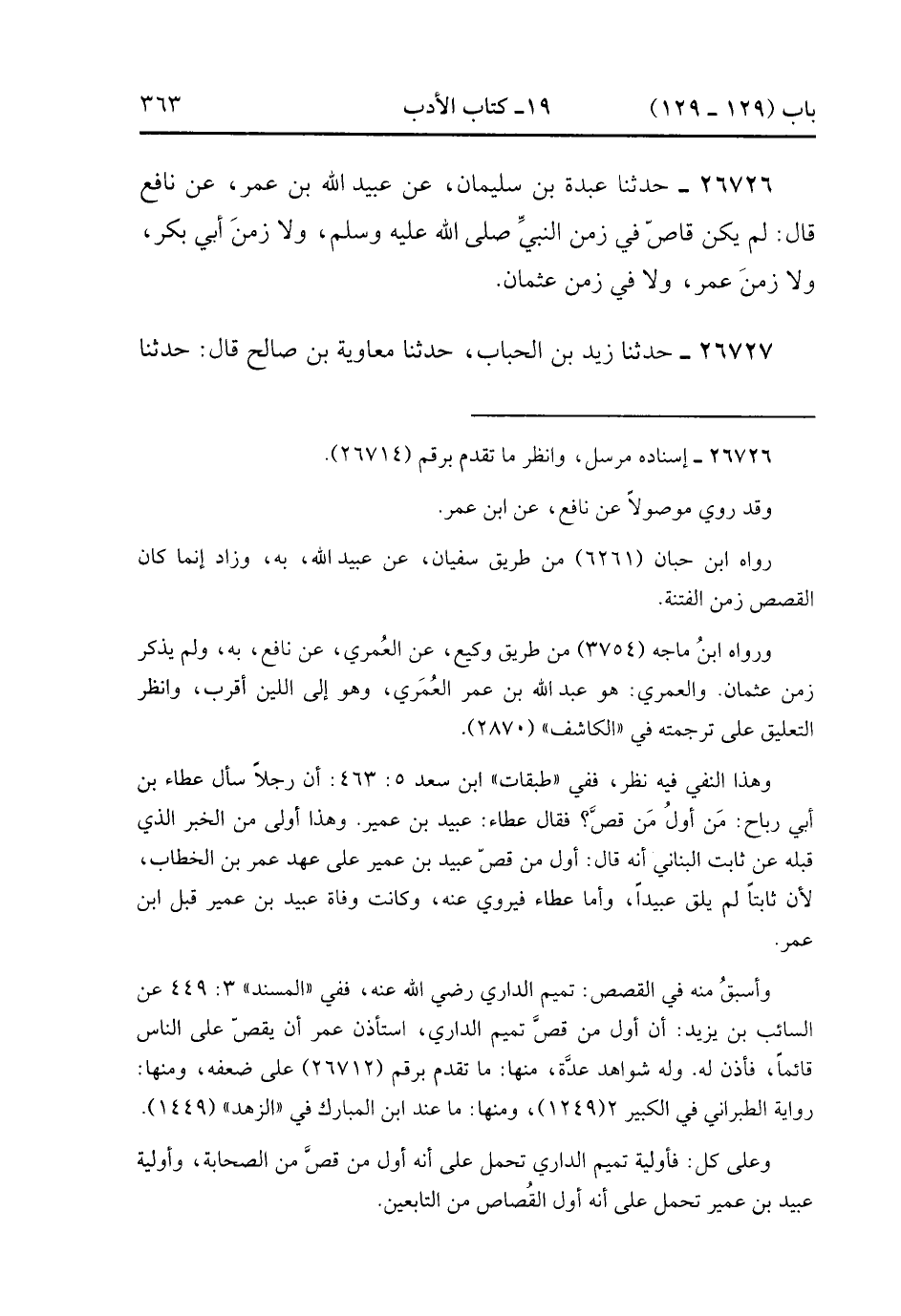 26726- حَدَّثَنَا عَبْدَةُ بْنُ سُلَيْمَانَ ، عَنْ عُبَيْدِ اللهِ بْنِ عُمَرَ ، عَنْ نَافِعٍ ، قَالَ : لَمْ يَكُنْ قَاصٌّ فِي زَمَنِ النَّبِيِّ صَلَّى الله عَلَيْهِ وَسَلَّمَ ، وَلاَ زَمَنِ أَبِي بَكْرٍ ، وَلاَ زَمَنِ عُمَرَ ، وَلاَ فِي زَمَنِ عُثْمَانَ.