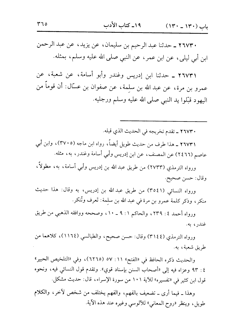 26731- حَدَّثَنَا ابْنُ إدْرِيسَ وَغُنْدَرٌ ، وَأَبُو أُسَامَةَ ، عَنْ شُعْبَةَ ، عَنْ عَمْرِو بْنِ مُرَّةَ ، عَنْ عَبْدِ اللهِ بْنِ سَلِمَةَ ، عَنْ صَفْوَانَ بْنِ عَسَّالٍ ، أَنَّ قَوْمًا مِنَ الْيَهُودِ قَبَّلُوا يَدَ النَّبِيِّ صَلَّى الله عَلَيْهِ وَسَلَّمَ وَرِجْلَيْهِ. (8/562).