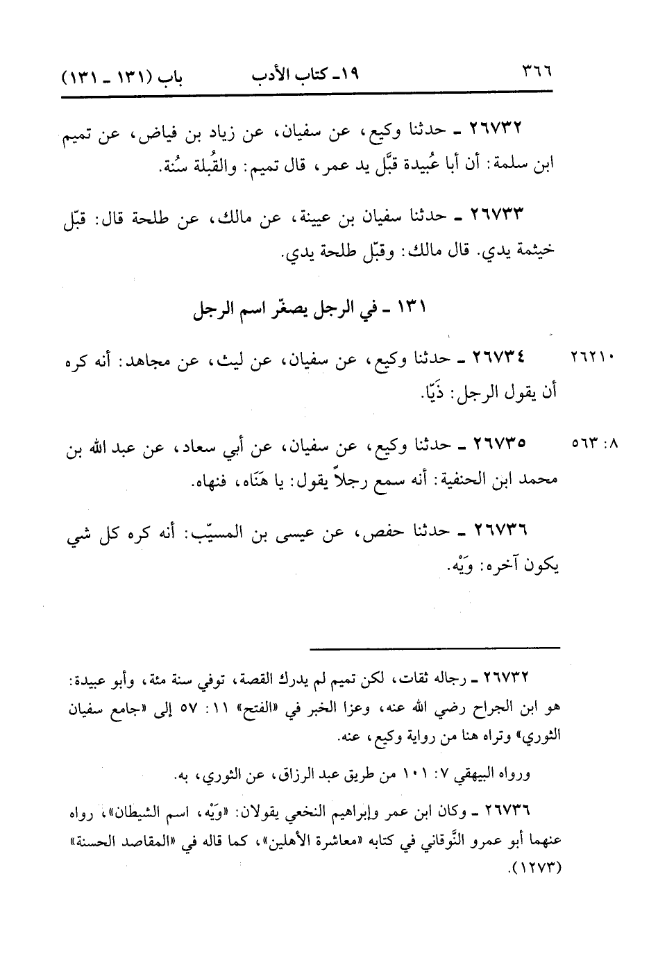 26733- حَدَّثَنَا سُفْيَانُ بْنُ عُيَيْنَةَ ، عَنْ مَالِكٍ ، عَنْ طَلْحَةَ ، قَالَ : قبَّلَ خَيْثَمَةُ يَدِي ، قَالَ مَالِكٌ : وَقَبَّلَ طَلْحَةُ يَدِي.
