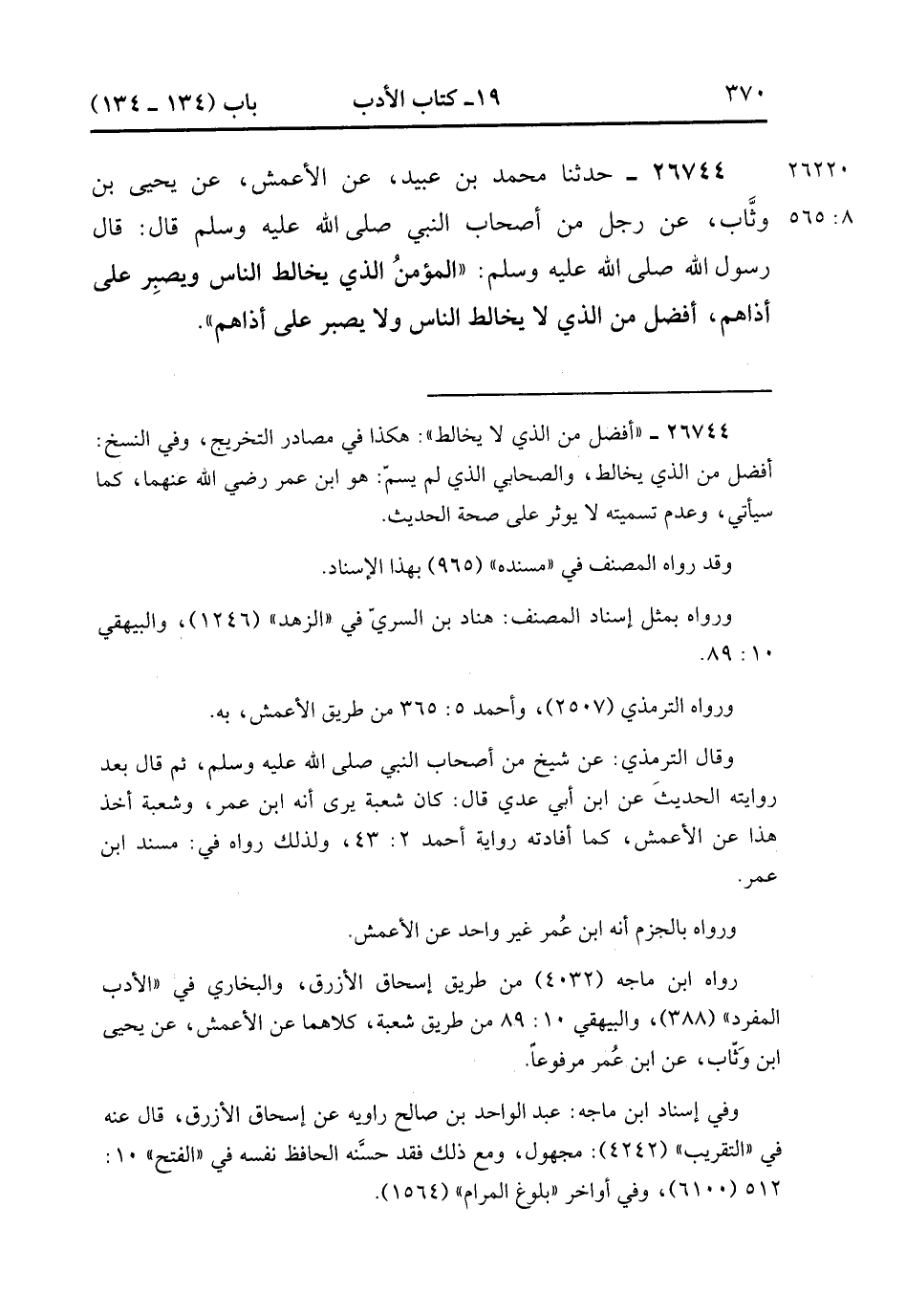 26744- حَدَّثَنَا مُحَمَّدُ بْنُ عُبَيْدٍ ، عَنِ الأَعْمَشِ ، عَنْ يَحْيَى بْنِ وَثَّابٍ ، عَنْ رَجُلٍ مِنْ أَصْحَابِ النَّبِيِّ صَلَّى الله عَلَيْهِ وَسَلَّمَ ، قَالَ : قَالَ رَسُولُ اللهِ صَلَّى الله عَلَيْهِ وَسَلَّمَ : الْمُؤْمِنُ الَّذِي يُخَالِطُ النَّاسَ وَيَصْبِرُ عَلَى أَذَاهُمْ أَفْضَلُ مِنَ الَّذِي لاَ يُخَالِطُ النَّاسَ ، وَلاَ يَصْبِرُ عَلَى أَذَاهُمْ. (8/564).