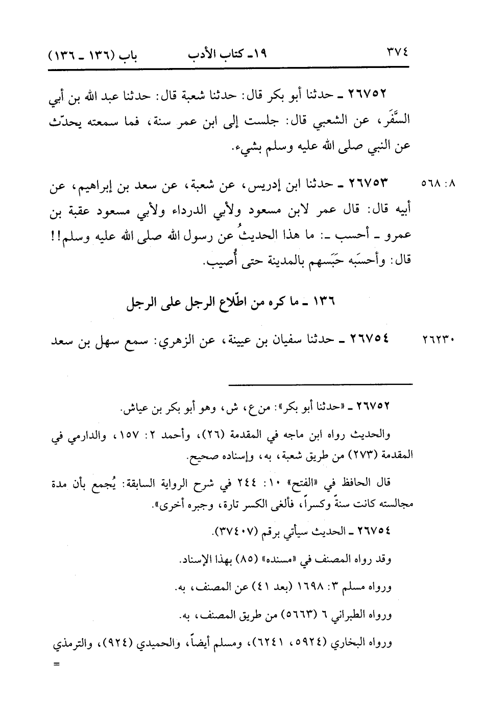 26752- حَدَّثَنَا أَبُو بَكر ، قَالَ : حَدَّثَنَا شُعْبَةُ , قَالَ : حدَّثَنَا عَبْدُ اللهِ بْنُ أَبِي السَّفَرِ ، عَنِ الشَّعْبِيِّ ، قَالَ : جَلَسْت إلَى ابْنِ عُمَرَ سَنَةً فَمَا سَمِعْته يُحَدِّثُ عَنِ النَّبِيِّ صَلَّى الله عَلَيْهِ وَسَلَّمَ بِشَيْءٍ. (8/567).