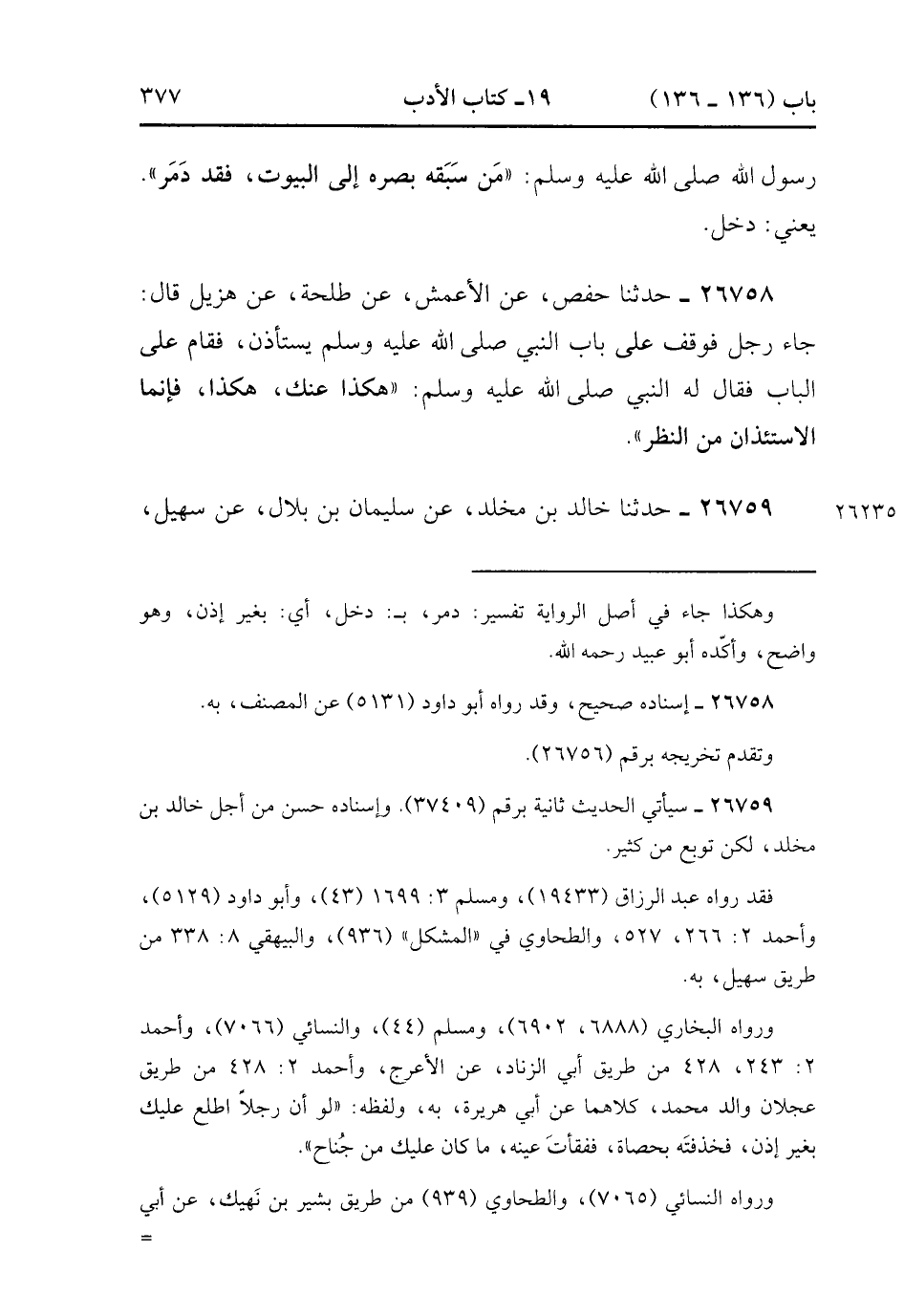 26758- حَدَّثَنَا حَفْصٌ ، عَنِ الأَعْمَشِ ، عَنْ طَلْحَةَ ، عَنْ هُزَيْلٍ ، قَالَ : جَاءَ رَجُلٌ فَوَقَفَ عَلَى بَابِ النَّبِيِّ صَلَّى الله عَلَيْهِ وَسَلَّمَ يَسْتَأْذِنُ ، فَقَامَ عَلَى الْبَابِ ، فَقَالَ له النَّبِيُّ صَلَّى الله عَلَيْهِ وَسَلَّمَ : هَكَذَا ، عَنك هَكَذَا ، فَإِنَّمَا الاِسْتِئْذَانُ مِنَ النَّظَرِ. (8/569).