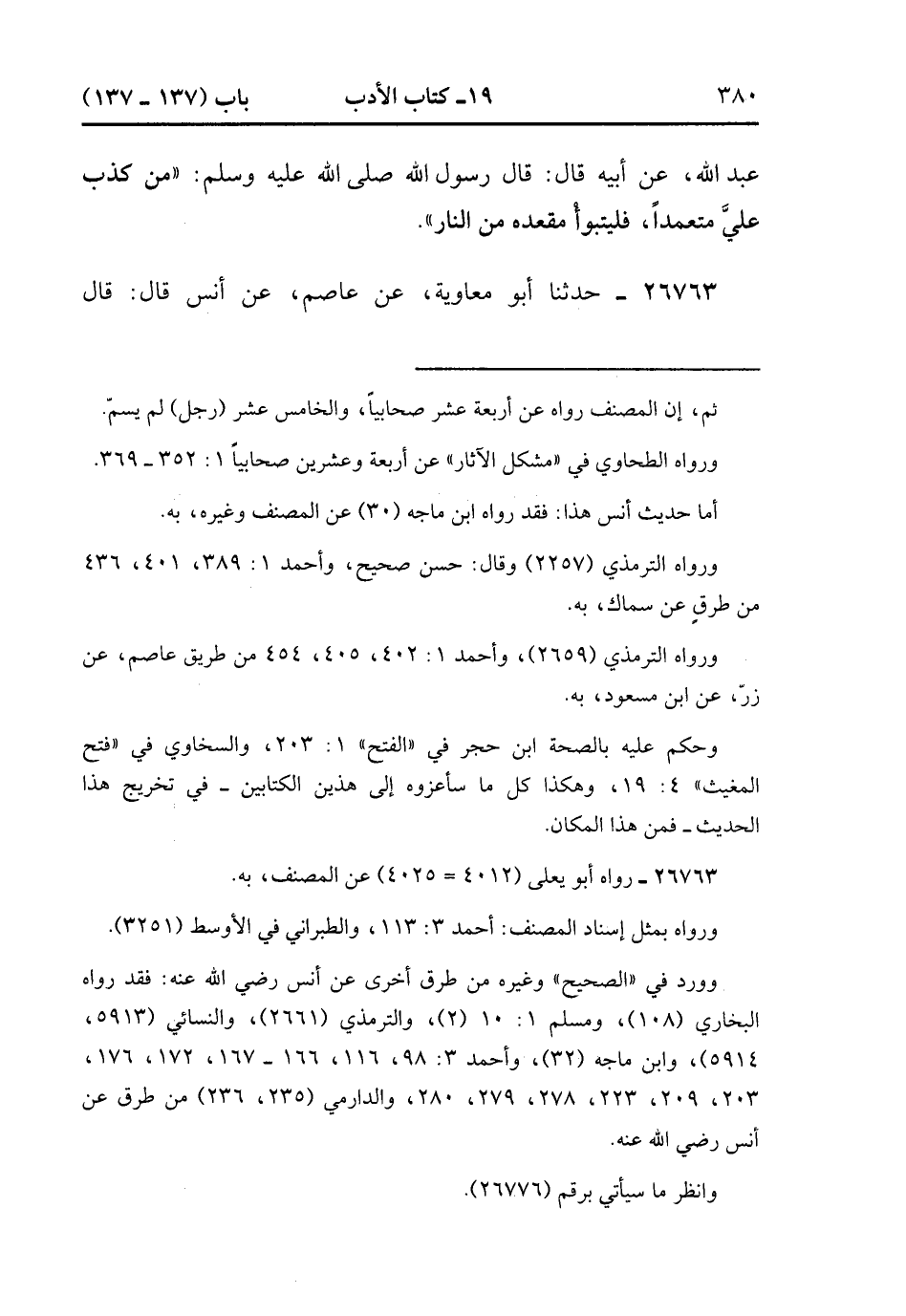 26763- حَدَّثَنَا أَبُو مُعَاوِيَةَ ، عَنْ عَاصِمٍ ، عَنْ أَنَسٍ ، قَالَ : قَالَ رَسُولُ اللهِ صَلَّى الله عَلَيْهِ وَسَلَّمَ : مَنْ كَذَبَ عَلَيَّ مُتَعَمِّدًا فَلْيَتَبَوَّأْ مَقْعَدَهُ مِنَ النَّارِ. (8/571).