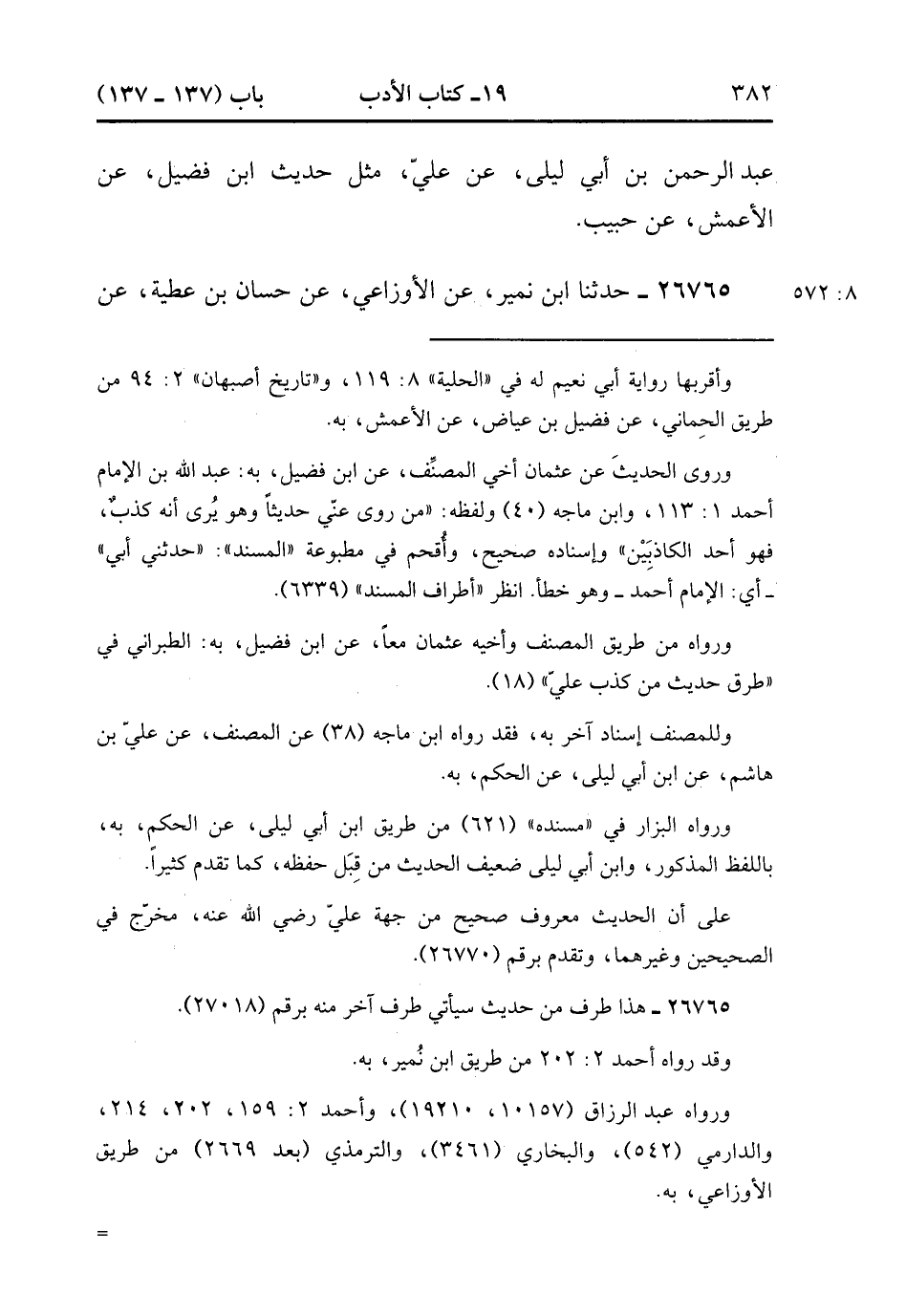 26765- حَدَّثَنَا ابْنُ نُمَيْرٍ ، عَنِ الأَوْزَاعِيِّ ، عَنْ حَسَّانَ بْنِ عَطِيَّةَ ، عَنْ أَبِي كَبْشَةَ ، عَنْ عَبْدِ اللهِ بْنِ عَمْرٍو ، قَالَ : قَالَ رَسُولُ اللهِ صَلَّى الله عَلَيْهِ وَسَلَّمَ : مَنْ كَذَبَ عَلَيَّ مُتَعَمِّدًا فَلْيَتَبَوَّأْ مَقْعَدَهُ مِنَ النَّارِ. (8/572).