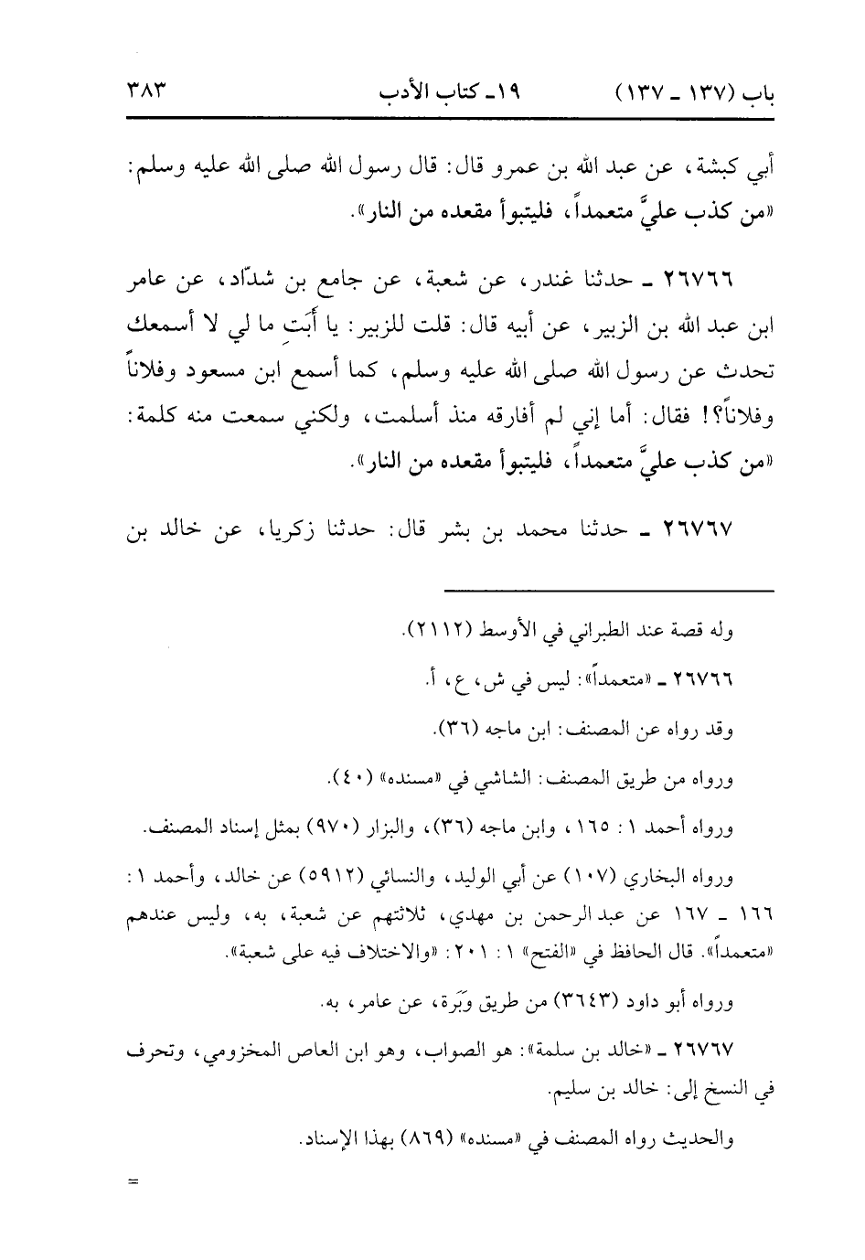 26766- حَدَّثَنَا غُنْدَرٌ ، عَنْ شُعْبَةَ ، عَنْ جَامِعِ بْنِ شَدَّادٍ ، عَنْ عَامِرِ بْنِ عَبْدِ اللهِ بْنِ الزُّبَيْرِ ، عَنْ أَبِيهِ ، قَالَ : قُلْتُ لِلزُّبَيْرِ : يَا أَبَتِي ، مَالِي لاَ أَسْمَعُك تُحَدِّثُ عَنْ رَسُولِ اللهِ صَلَّى الله عَلَيْهِ وَسَلَّمَ كَمَا أسْمَعُ ابْنَ مَسْعُودٍ وَفُلاَنًا وَفُلاَنًا ؟ فَقَالَ : أما إنِّي لَمْ أُفَارِقْهُ مُنْذُ أَسْلَمْت ، وَلَكِنِّي سَمِعْت مِنْهُ كَلِمَةً : مَنْ كَذَبَ عَلَيَّ مُتَعَمِّدًا فَلْيَتَبَوَّأْ مَقْعَدَهُ مِنَ النَّارِ.