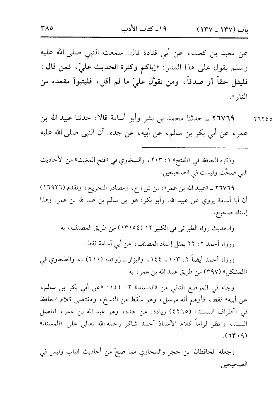26769- حَدَّثَنَا مُحَمَّدُ بْنُ بِشْرٍ ، وَأَبُو أُسَامَةَ , قَالَ : حدَّثَنَا عُبَيْدُ اللهِ بْنُ عُمَرَ ، عَنْ أَبِي بَكْرِ بْنِ سَالِمٍ ، عَنْ أَبِيهِ ، عَنْ جَدِّهِ ، أَنَّ النَّبِيَّ صَلَّى الله عَلَيْهِ وَسَلَّمَ ، قَالَ : إنَّ الَّذِي يَكْذِبُ عَلَيَّ يَبْنَى لَهُ بَيْتٌ فِي النَّارِ. (8/573).