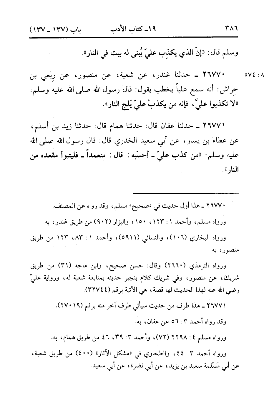 26770- حَدَّثَنَا غُنْدَرٌ ، عَنْ شُعْبَةَ ، عَنْ مَنْصُورٍ ، عَنْ رِبْعِيِّ بْنِ حِرَاشٍ ، أَنَّهُ سَمِعَ عَلِيًّا يَخْطُبُ يَقُولُ : قَالَ رَسُولُ اللهِ صَلَّى الله عَلَيْهِ وَسَلَّمَ : لاَ تَكْذِبُوا عَلَيَّ ، فَإِنَّهُ مَنْ يَكْذِبْ عَلَيَّ يَلِجَ النَّارَ. (8/573).