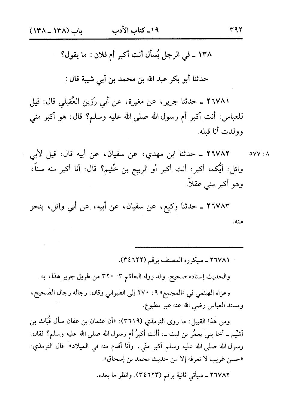 26781- حدَّثَنَا جَرِيرٌ ، عَنْ مُغِيرَةَ ، عَنْ أَبِي رَزِينٍ ، قَالَ : قِيلَ لِلْعَبَّاسِ : أَنْتَ أَكْبَرُ ، أَوْ رَسُولُ اللهِ صَلَّى الله عَلَيْهِ وَسَلَّمَ ؟ قَالَ : هُوَ أَكْبَرُ مِنِّي وَوُلِدْت أَنَا قَبْلَهُ. (8/576).