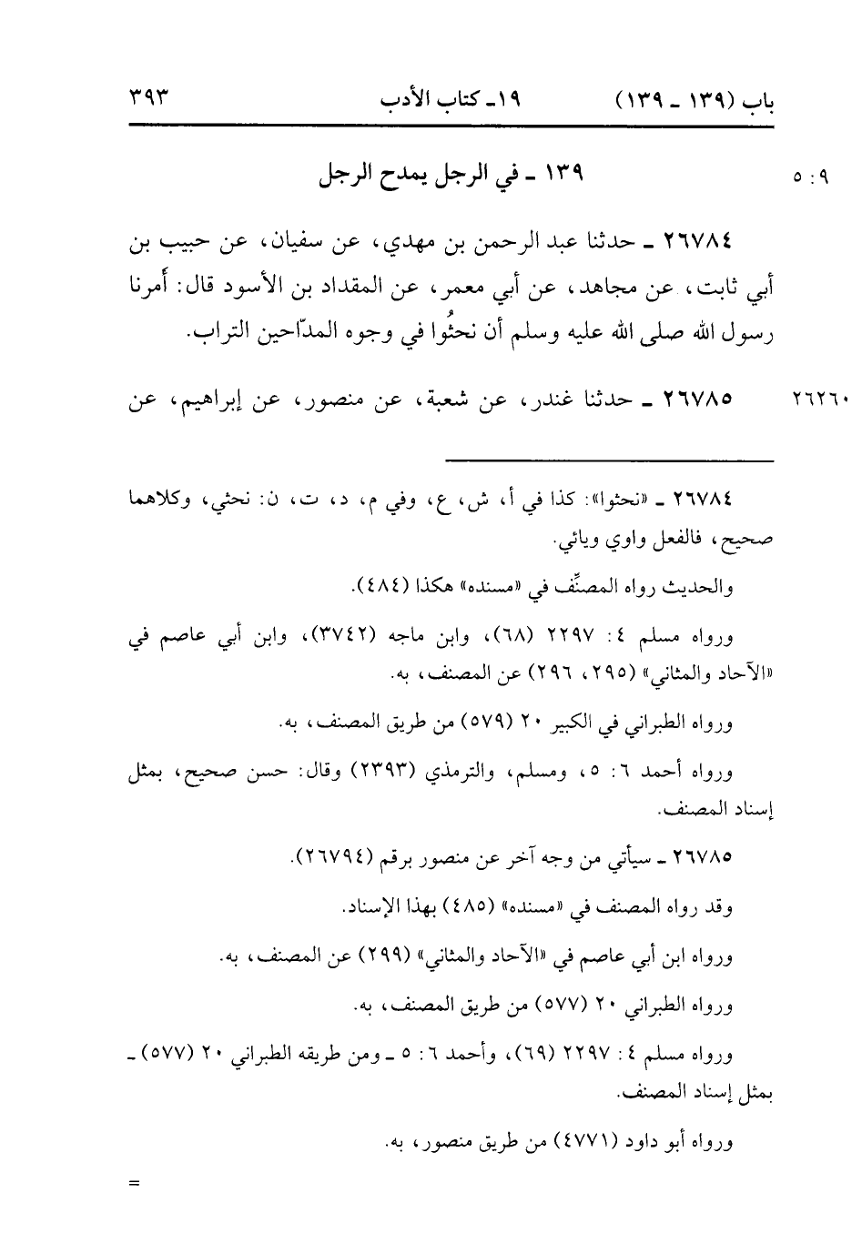26784- حَدَّثَنَا عَبْدُ الرَّحْمَنِ بْنُ مَهْدِيٍّ ، عَنْ سُفْيَانَ ، عَنْ حَبِيبِ بْنِ أَبِي ثَابِتٍ ، عَنْ مُجَاهِدٍ ، عَنْ أَبِي مَعْمَرٍ ، عَنِ الْمِقْدَادِ بْنِ الأَسْوَدِ قَالَ : أَمَرَنَا رَسُولُ اللهِ صَلَّى الله عَلَيْهِ وَسَلَّمَ أَنْ نَحْثُوَ فِي وُجُوهِ الْمَدَّاحِينَ التُّرَابَ. (9/5).