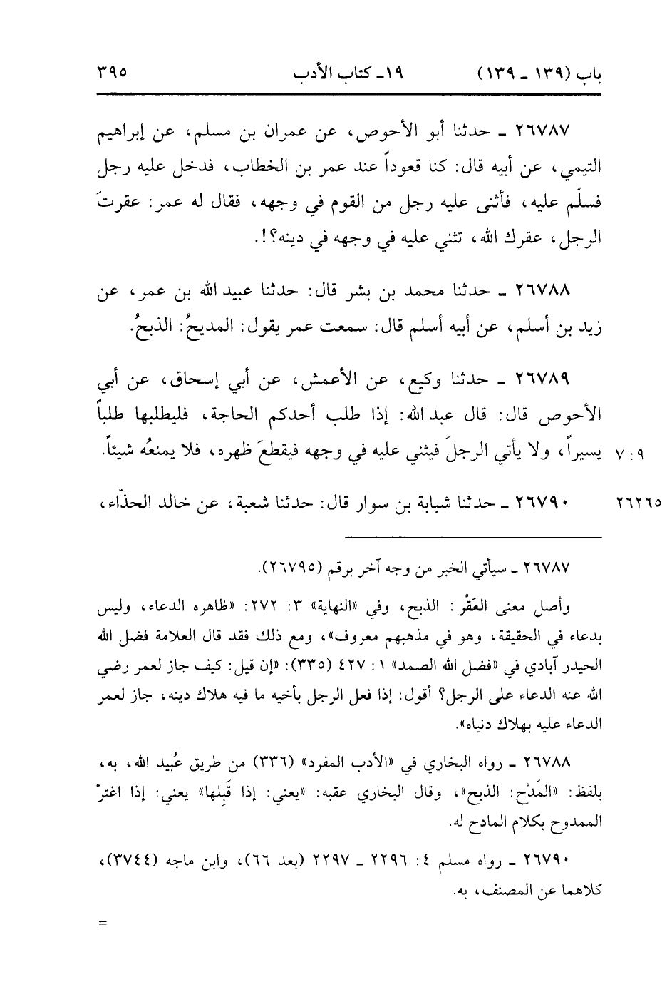 26788- حَدَّثَنَا مُحَمَّدُ بْنُ بِشْرٍ , قَالَ : حدَّثَنَا عُبَيْدُ اللهِ بْنُ عُمَرَ ، عَنْ زَيْدِ بْنِ أَسْلَمَ ، عَنْ أَبِيهِ أَسْلَمَ ، قَالَ : سَمِعْتُ عُمَرَ يَقُولُ : الْمَدِيحُ الذَّبْحُ.