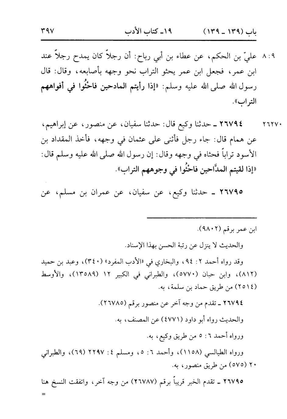 26794- حَدَّثَنَا وَكِيعٌ , قَالَ : حدَّثَنَا سُفْيَانُ ، عَنْ مَنْصُورٍ ، عَنْ إبْرَاهِيمَ ، عَنْ هَمَّامٍ قَالَ : جَاءَ رَجُلٌ فَأَثْنَى عَلَى عُثْمَانَ فِي وَجْهِهِ فَأَخَذَ الْمِقْدَادُ بْنُ الأَسْوَدِ تُرَابًا فَحَثَاهُ فِي وَجْهِهِ ، وَقَالَ : إنَّ رَسُولَ اللهِ صَلَّى الله عَلَيْهِ وَسَلَّمَ قَالَ : إذَا لَقِيتُمَ الْمَدَّاحِينَ فَاحْثُوا فِي وُجُوهِهِمَ التُّرَابَ.