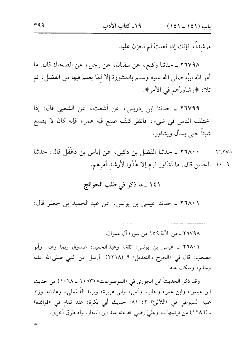 26800- حَدَّثَنَا الْفَضْلُ بْنُ دُكَيْنٍ ، عَنْ إيَاسِ بْنِ دَغْفَلٍ , قَالَ : حدَّثَنَا الْحَسَنُ قَالَ : مَا تشَاوَرَ قَوْمٌ إلاَّ هُدُوا لأَرْشَدِ أَمْرِهِمْ. (9/10).