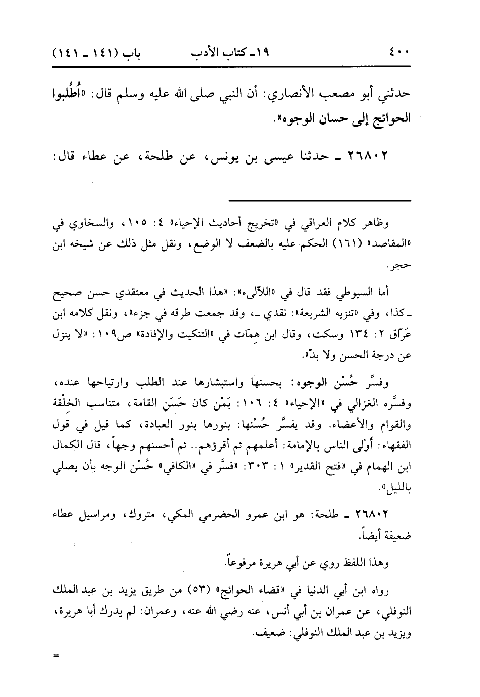 26802- حَدَّثَنَا عِيسَى بْنُ يُونُسَ ، عَنْ طَلْحَةَ ، عَنْ عَطَاءٍ قَالَ : قَالَ رَسُولُ اللهِ صَلَّى الله عَلَيْهِ وَسَلَّمَ : ابْتَغُوا الْخَيْرَ عِنْدَ حِسَانِ الْوُجُوهِ. (9/10).