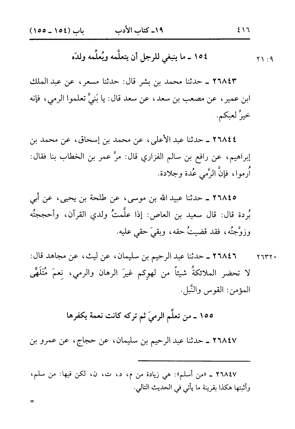 26846- حَدَّثَنَا عَبْدُ الرَّحِيمِ بْنُ سُلَيْمَانَ ، عَنْ لَيْثٍ ، عَنْ مُجَاهِدٍ قَالَ : لاَ تَحْضُرُ الْمَلاَئِكَةُ شَيْئًا مِنْ لَهْوِكُمْ غَيْرَ الرِّهَانِ وَالرَّمْيِ ، نِعْمَ مُلْتَهَى الْمُؤْمِنِ الْقَوْسُ وَالنَّبْلُ. (9/21).