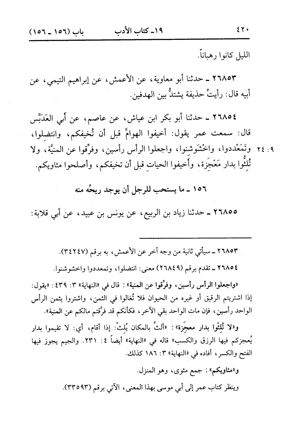 26854- حَدَّثَنَا أَبُو بَكْر بْنُ عَيَّاشٍ ، عَنْ عَاصِمٍ ، عَنْ أَبِي الْعَدَبَّسِ ، قَالَ : سَمِعْتُ عُمَرَ يَقُولُ : أَخِيفُوا الْهَوَامَّ قَبْلَ أَنْ تُخِيفَكُمْ ، وَانْتَضِلُوا وَتَمَعْدَدُوا وَاخْشَوْشِنُوا وَاجْعَلُوا الرَّأْسَ رَأْسَيْنِ ، وَفَرِّقُوا عَنِ الْمَنِيَّةِ ، وَلاَ تُلِثُّوا بِدَارٍ مُعْجِزَةٍ ، وَأَخِيفُوا الْحَيَّاتِ قَبْلِ أَنْ تُخِيفَكُمْ وَأَصْلِحُوا مَثَاوِيَكُمْ. (9/23).