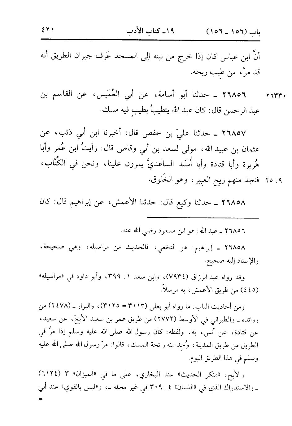 26856- حَدَّثَنَا أَبُو أُسَامَةَ ، عَنْ أَبِي الْعُمَيْسِ ، عَنِ الْقَاسِمِ بْنِ عَبْدِ الرَّحْمَنِ قَالَ : كَانَ عَبْدُ اللهِ يَتَطَيَّبُ بِطِيبٍ فِيهِ مِسْكٌ.