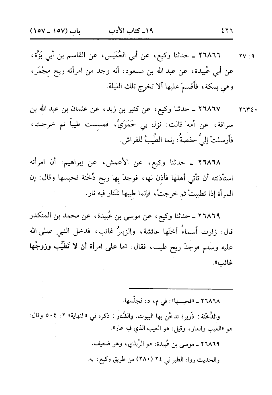 26869- حَدَّثَنَا وَكِيعٌ ، عَنْ مُوسَى بْنِ عُبَيْدَةَ ، عَنْ مُحَمَّدِ بْنِ الْمُنْكَدِرِ قَالَ : زَارَتْ أَسْمَاءُ أُخْتَهَا عَائِشَةَ ، وَالزُّبَيْرُ غَائِبٌ ، فَدَخَلَ النَّبِيُّ صَلَّى الله عَلَيْهِ وَسَلَّمَ فَوَجَدَ رِيحَ طِيبٍ فَقَالَ : مَا عَلَى امْرَأَةٍ أَنْ لاَ تَطَيَّبَ وَزَوْجُهَا غَائِبٌ. (9/27).