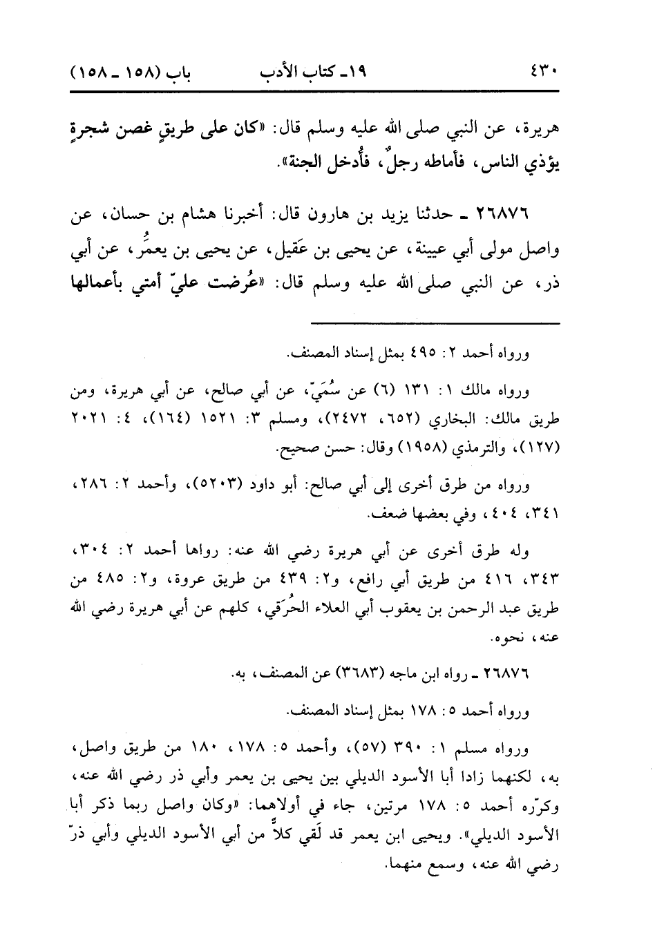 26876- حَدَّثَنَا يَزِيدُ بْنُ هَارُونَ , قَالَ : أَخْبَرَنَا هِشَامُ بْنُ حَسَّانَ ، عَنْ وَاصِلٍ مَوْلَى أَبِي عُيَيْنَةَ ، عَنْ يَحْيَى بْنِ عَقِيلٍ ، عَنْ يَحْيَى بْنِ يَعْمُرَ ، عَنْ أَبِي ذَرٍّ ، عَنِ النَّبِيِّ صَلَّى الله عَلَيْهِ وَسَلَّمَ قَالَ : عُرِضَتْ عَلَيَّ أُمَّتِي بِأَعْمَالِهَا ، حَسَنِهَا وَسَيِّئِهَا ، فَرَأَيْت فِي مَحَاسِنِ أَعْمَالِهَا الأَذَى يُنَحَّى عَنِ الطَّرِيقِ ، وَرَأَيْت فِي سَيِّىء أَعْمَالِهَا النُّخَامَةُ فِي الْمَسْجِدِ لاَ تُدْفَنُ. (9/29).
