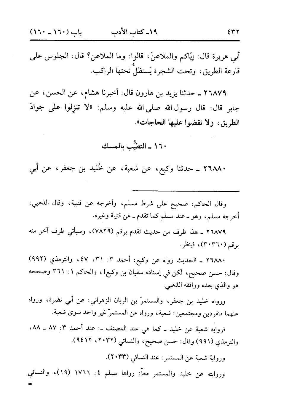 26879- حَدَّثَنَا يَزِيدُ بْنُ هَارُونَ , قَالَ : أَخْبَرَنَا هِشَامٌ ، عَنِ الْحَسَنِ ، عَنْ جَابِرٍ قَالَ : قَالَ رَسُولُ اللهِ صَلَّى الله عَلَيْهِ وَسَلَّمَ : لاَ تَنْزِلُوا عَلَى جَوَادِّ الطَّرِيقِ ، وَلاَ تَقْضُوا عَلَيْهَا الْحَاجَاتِ.