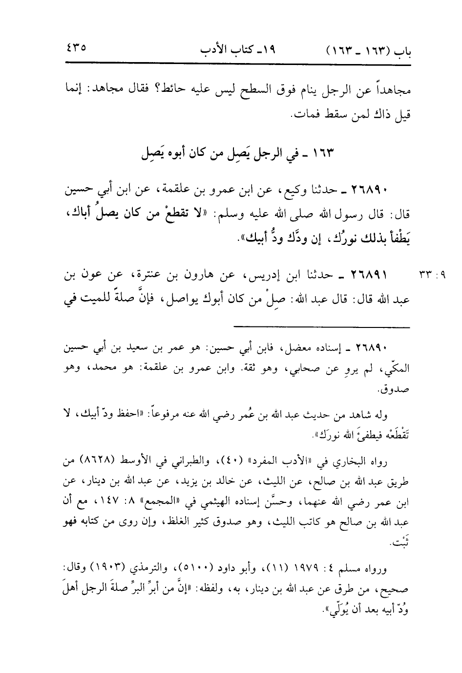 26890- حَدَّثَنَا وَكِيعٌ ، عَنِ ابْنِ عَمْرِو بْنِ عَلْقَمَةَ ، عَنِ ابْنِ أَبِي حُسَيْنٍ قَالَ : قَالَ رَسُولُ اللهِ صَلَّى الله عَلَيْهِ وَسَلَّمَ : لاَ تَقْطَعْ مَنْ كَانَ يَصِلُ أَبَاك ، يُطْفَأْ بِذَلِكَ نُورُك ، إنَّ وِدَّك وِدُّ أَبِيك. (9/32).