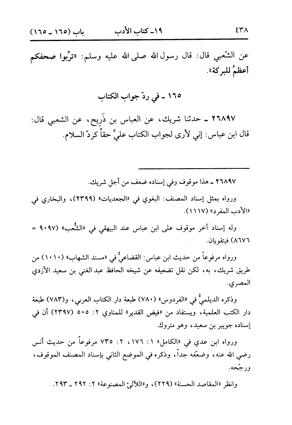 26897- حَدَّثَنَا شَرِيكٌ ، عَنِ الْعَبَّاسِ بْنِ ذُرَيْحٍ ، عَنِ الشَّعْبِيِّ قَالَ : قَالَ ابْنُ عَبَّاسٍ : إنِّي لأَرَى لِجَوَابِ الْكِتَابِ عَلَيَّ حَقًّا كَرَدِّ السَّلاَمِ. (9/34).