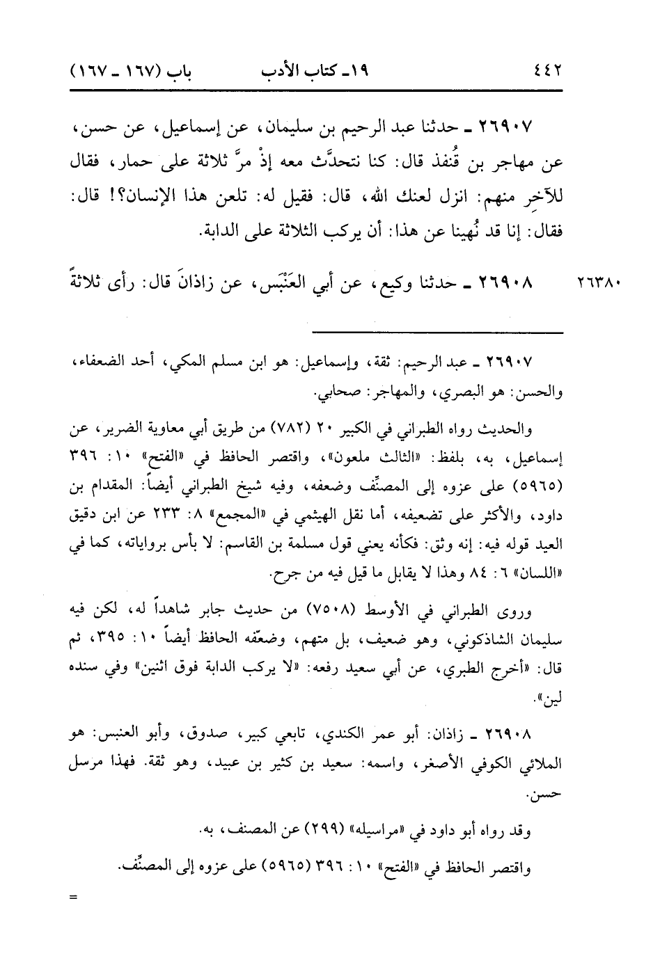 26908- حَدَّثَنَا وَكِيعٌ ، عَنْ أَبِي الَعَنَبَسِ ، عَنْ زَاذَانَ قَالَ : رَأَى ثَلاَثَةً عَلَى بَغْلٍ , فَقَالَ : لِيَنْزِلْ أَحَدُكُمْ , فَإِنَّ رَسُولَ اللهِ صَلَّى الله عَلَيْهِ وَسَلَّمَ لَعَنَ الثَّالِثَ. (9/36).