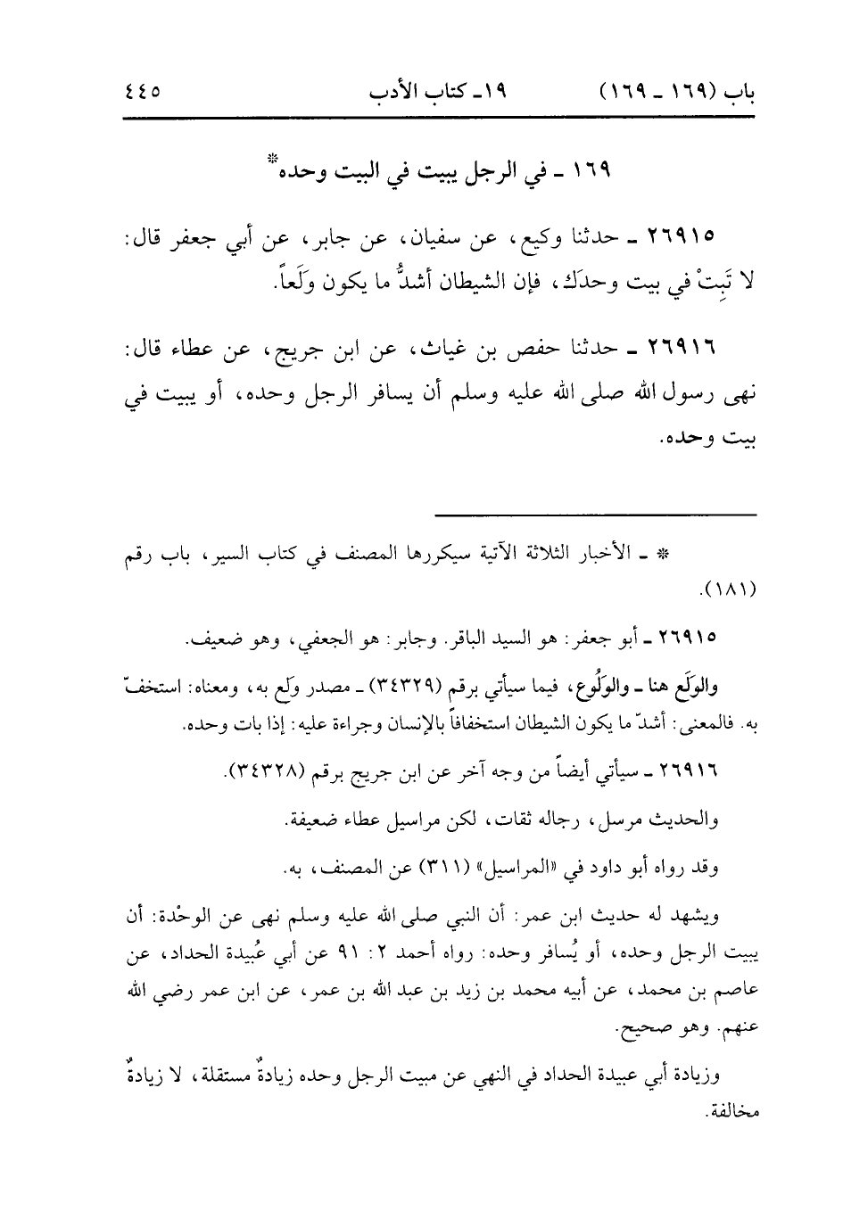 26916- حَدَّثَنَا حَفْصُ بْنُ غِيَاثٍ ، عَنِ ابْنِ جُرَيْجٍ ، عَنْ عَطَاءٍ قَالَ : نَهَى رَسُولُ اللهِ صَلَّى الله عَلَيْهِ وَسَلَّمَ أَنْ يُسَافِرَ الرَّجُلُ وَحْدَهُ ، أَوْ يَبِيتَ فِي بَيْتٍ وَحْدَهُ. (9/38).