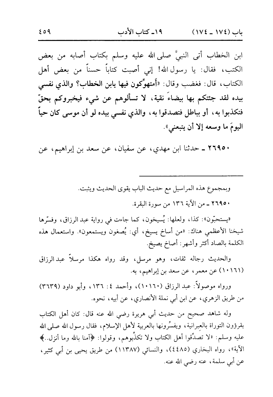 26950- حَدَّثَنَا ابْنُ مَهْدِيٍّ ، عَنْ سُفْيَانَ ، عَنْ سَعْدِ بْنِ إِبْرَاهِيمَ ، عَنْ عَطَاءِ بْنِ يَسَارٍ قَالَ : كَانَتِ الْيَهُودُ تَجِيءُ إلَى الْمُسْلِمِينَ فَيُحَدِّثُونَهُمْ فَيَسْتَحْسِنُونَ ، أَوْ قَالَ : يَسْتَحِبُّونَ ، فَذَكَرُوا ذَلِكَ لِرَسُولِ اللهِ صَلَّى الله عَلَيْهِ وَسَلَّمَ فَقَالَ : لاَ تُصَدِّقُوهُمْ ، وَلاَ تُكَذِّبُوهُمْ قُولُوا : {آمَنَّا بِاللَّهِ وَمَا أُنْزِلَ إلَيْنَا وَمَا أُنْزِلَ إلَيْكُمْ} إلَى آخِرِ الآيَةِ. (9/47).