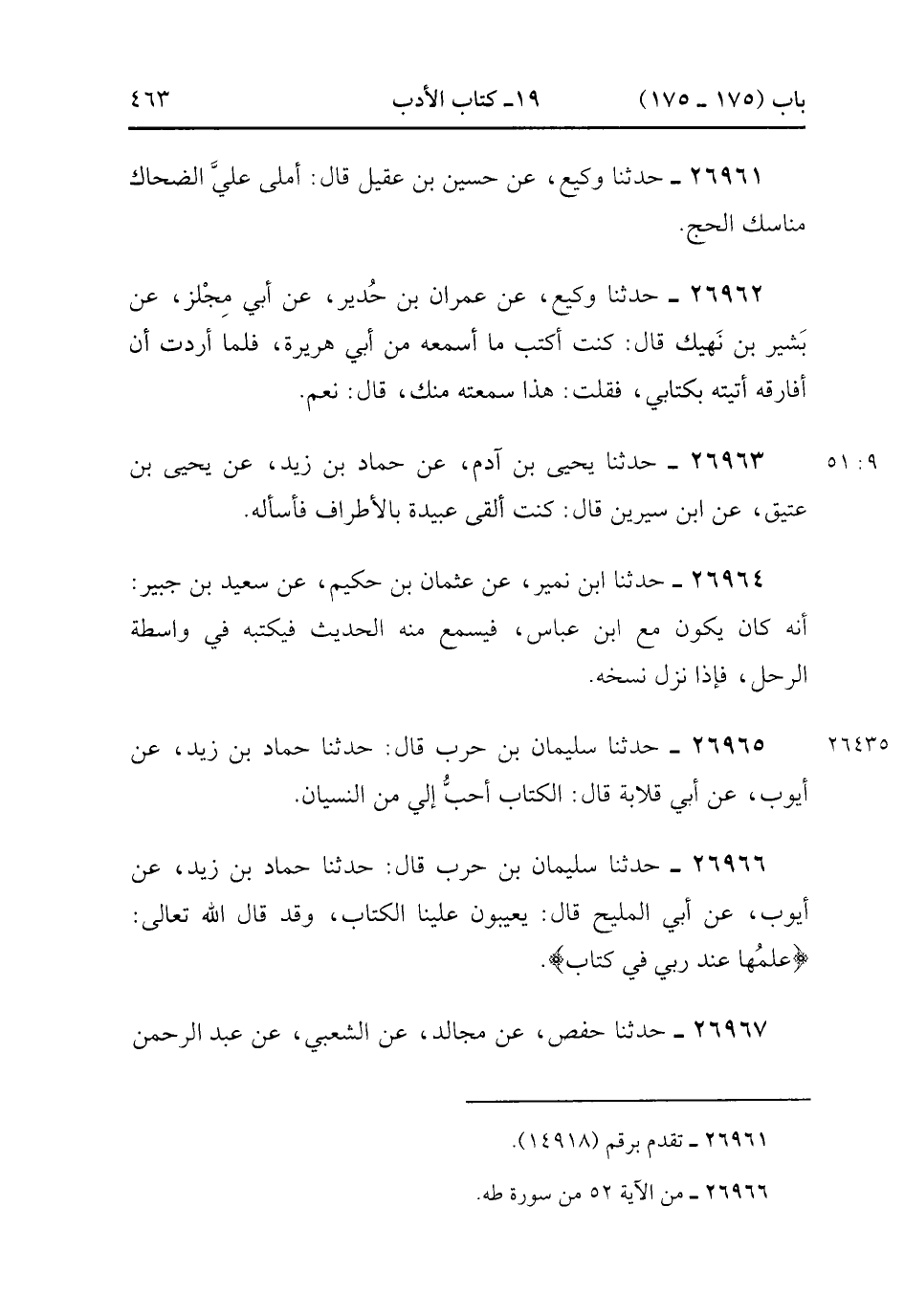 26966- حَدَّثَنَا سُلَيْمَانُ بْنُ حَرْبٍ , قَالَ : حدَّثَنَا حَمَّادُ بْنُ زَيْدٍ ، عَنْ أَيُّوبَ ، عَنْ أَبِي الْمَلِيحِ قَالَ : يَعِيبُونَ عَلَيْنَا الْكِتَابَ وَقَدْ قَالَ اللَّهُ تَعَالَى : {عِلْمُهَا عِنْدَ رَبِّي فِي كِتَابٍ}.