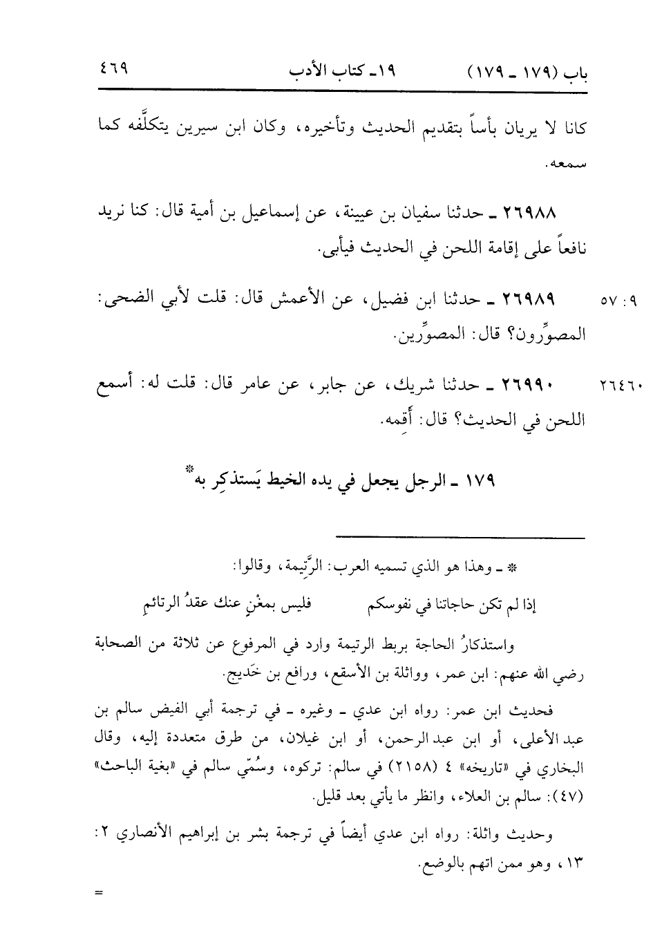 26990- حَدَّثَنَا شَرِيكٌ ، عَنْ جَابِرٍ ، عَنْ عَامِرٍ قَالَ : قُلْتُ لَهُ : أَسْمَعُ اللَّحْنَ فِي الْحَدِيثِ ؟ قَالَ : أَقِمْهُ. (9/57).