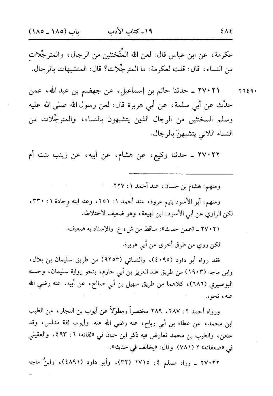 27021- حَدَّثَنَا حَاتِمُ بْنُ إسْمَاعِيلَ ، عَنْ جَهْضَمِ بْنِ عَبْدِ اللهِ ، عَمنْ حَدَّث عَنْ أَبِي سَلَمَةَ ، عَنْ أَبِي هُرَيْرَةَ قَالَ : لَعَنَ رَسُولُ اللهِ صَلَّى الله عَلَيْهِ وَسَلَّمَ الْمُتَخَنِّثِينَ مِنَ الرِّجَالِ الَّذِينَ يَتَشَبَّهُونَ بِالنِّسَاءِ ، وَالْمُتَرَجِّلاَت مِنَ النِّسَاءِ اللاَتِي يَتَشَبَّهْنَ بِالرِّجَالِ.