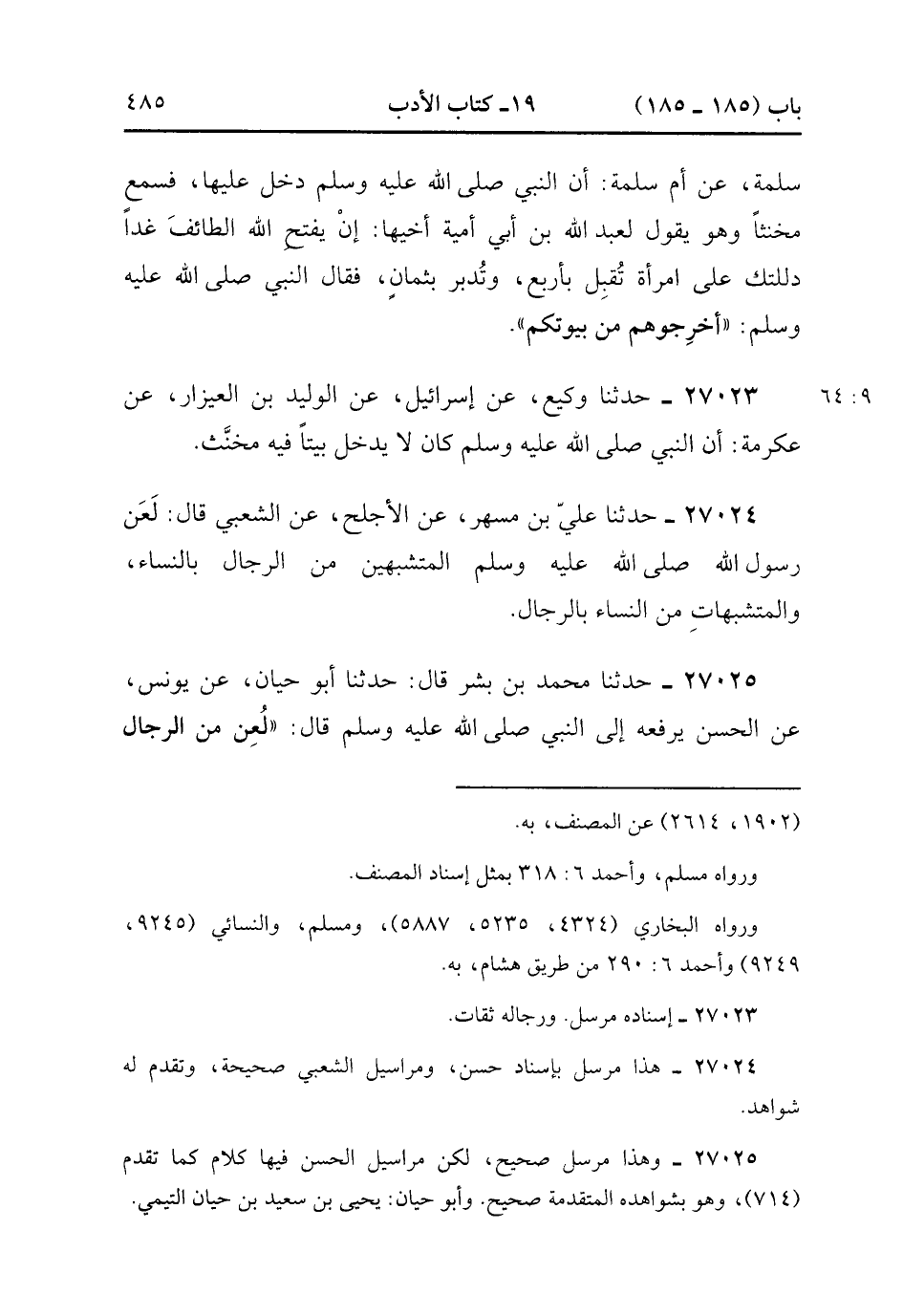 27025- حَدَّثَنَا مُحَمَّدُ بْنُ بِشْرٍ , قَالَ : حدَّثَنَا أَبُو حَيَّانَ ، عَنْ يُونُسَ ، عَنِ الْحَسَنِ يَرْفَعُهُ إلَى النَّبِيِّ صَلَّى الله عَلَيْهِ وَسَلَّمَ قَالَ : لُعِنَ مِنَ الرِّجَالِ الْمُتَشَبِّهُ بِالنِّسَاءِ وَلُعِنَ مِنَ النِّسَاءِ الْمُتَشَبِّهَةُ الْمُتَرَجِّلَةُ. (9/64).