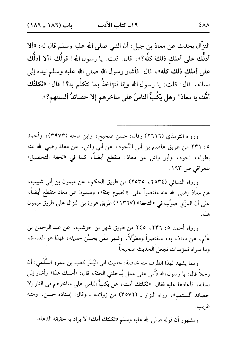 27029- حَدَّثَنَا غُنْدَرٌ ، عَنْ شُعْبَةَ ، عَنِ الْحَكَمِ ، قَالَ : سَمِعْتُ عُرْوَةَ بْنَ النَّزَّالِ , يُحَدِّثُ عَنْ مُعَاذِ بْنِ جَبَلٍ ، أَنَّ النَّبِيَّ صَلَّى الله عَلَيْهِ وَسَلَّمَ قَالَ لَهُ : أَلاَ أَدُلُّك عَلَى أَمْلَكِ ذَلِكَ كُلِّهِ ، قَالَ : قُلْتُ : يَا رَسُولَ اللهِ ، قَوْلُك أَلاَ أَدُلُّكَ عَلَى أَمْلَكِ ذَلِكَ كُلِّهِ قَالَ : فَأَشَارَ رَسُولُ اللهِ صَلَّى الله عَلَيْهِ وَسَلَّمَ بِيَدِه إلَى لِسَانِهِ ، قَالَ : قُلْتُ : يَا رَسُولَ اللهِ ، وَإِنَّا لَنُؤَاخَذُ بِمَا نَتَكَلَّمُ بِهِ ، قَالَ : ثَكِلَتْك أُمُّك يا مُعَاذُ ، وَهَلْ يَكُبُّ النَّاسَ عَلَى مَنَاخِرِهِمْ إلاَّ حَصَائِدُ أَلْسِنَتِهِمْ , قَالَ شُعْبَةُ : وَقَالَ الْحَكَمُ : وَحَدَّثَنِي بِهِ مَيْمُونُ بْنُ أَبِي شَبِيبٍ , وَسَمِعْته مِنْهُ مُنْذُ أَرْبَعِينَ سَنَةً. (9/65).