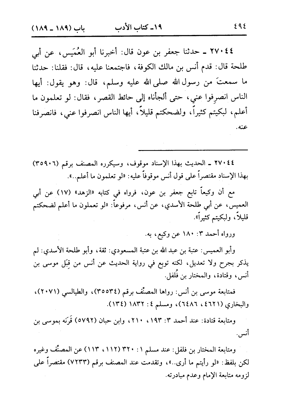 27044- حَدَّثَنَا جَعْفَرُ بْنُ عَوْنٍ , قَالَ : أَخْبَرَنَا أَبُو الْعُمَيْسِ ، عَنْ أَبِي طَلْحَةَ قَالَ : قَدِمَ أَنَسُ بْنُ مَالِكٍ الْكُوفَةَ فَاجْتَمَعَنا عَلَيْهِ ، قَالَ : فَقُلْنَا : حَدِّثْنَا مَا سَمِعْت مِنْ رَسُولِ اللهِ صَلَّى الله عَلَيْهِ وَسَلَّمَ قَالَ : وَهُوَ يَقُولُ : أَيُّهَا النَّاسُ ، انْصَرِفُوا عَنِّي ، حَتَّى أَلْجَأْنَاهُ إلَى حَائِطِ الْقَصْرِ فَقَالَ : لَوْ تَعْلَمُونَ مَا أَعْلَمُ لَبَكَيْتُمْ كَثِيرًا وَلَضَحِكْتُمْ قَلِيلاً أَيُّهَا النَّاسُ ، انْصَرِفُوا عَنِّي ، فَانْصَرَفْنَا عَنهُ. (9/69).