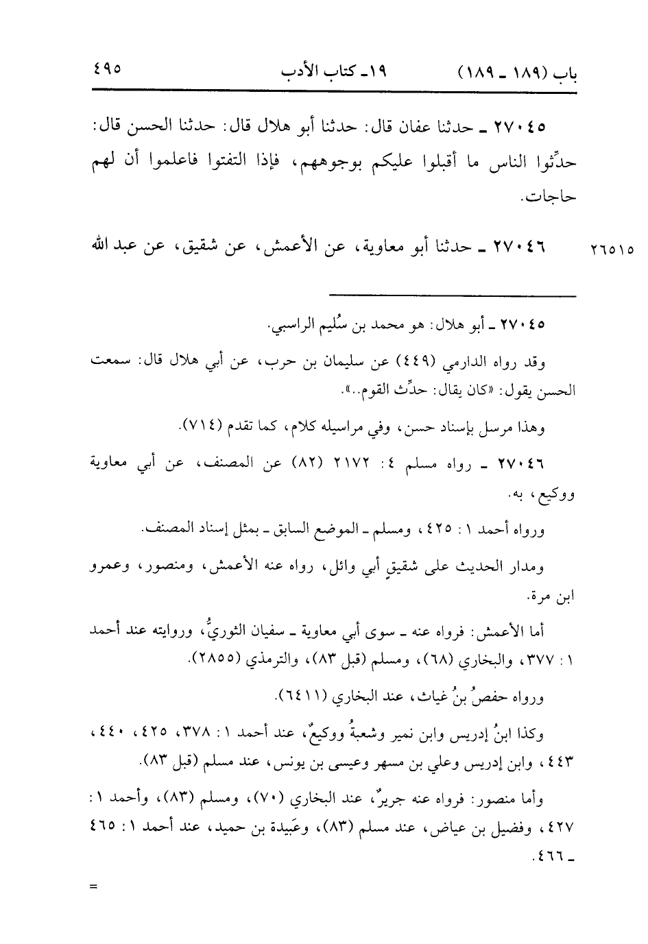 27046- حَدَّثَنَا أَبُو مُعَاوِيَةَ ، عَنِ الأَعْمَشِ ، عَنْ شَقِيقٍ ، عَنْ عَبْدِ اللهِ قَالَ : كَانَ رَسُولُ اللهِ صَلَّى الله عَلَيْهِ وَسَلَّمَ يَتَخَوَّلُنَا بِالْمَوْعِظَةِ مَخَافَةَ السَّآمَةِ عَلَيْنَا. (9/70).