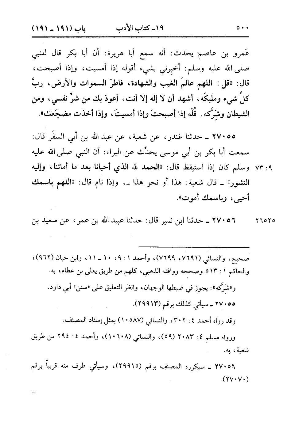 27055- حَدَّثَنَا غُنْدَرٌ ، عَنْ شُعْبَةَ ، عَنْ عَبْدِ اللهِ بْنِ أَبِي السَّفَرِ ، قَالَ : سَمِعْتُ أَبَا بَكْرِ بْنَ أَبِي مُوسَى يُحَدِّثُ عَنِ الْبَرَاءِ ، أَنَّ النَّبِيَّ صَلَّى الله عَلَيْهِ وَسَلَّمَ كَانَ إذَا اسْتَيْقَظَ قَالَ : الْحَمْدُ لِلَّهِ الَّذِي أَحْيَانَا بَعْدَ مَا أَمَاتَنَا وَإِلَيْهِ النُّشُورُ ، قَالَ شُعْبَةُ : هَذَا ، أَوْ نَحْوَ هَذَا وَإِذَا نَامَ قَالَ : اللَّهُمَّ بِاسْمِكَ أَحْيَا وَبِاسْمِكَ أَمُوتُ. (9/72).