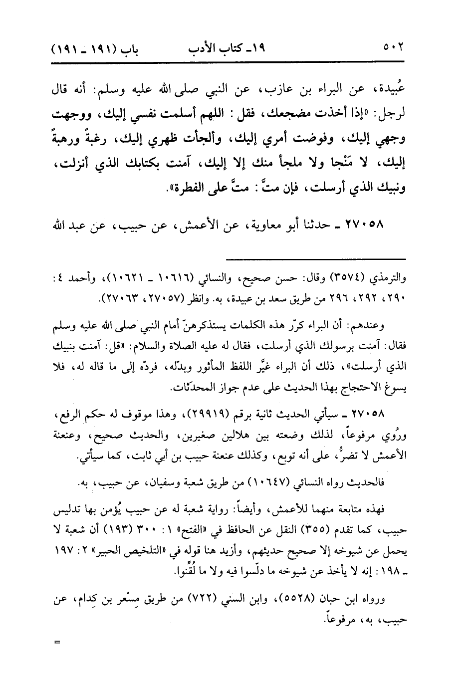 27057- حَدَّثَنَا غُنْدَرٌ ، عَنْ شُعْبَةَ ، عَنْ عَمْرِو بْنِ مُرَّةَ ، عَنْ سَعْدِ بْنِ عُبَيْدَةَ ، عَنِ الْبَرَاءِ بْنِ عَازِبٍ ، عَنِ النَّبِيِّ صَلَّى الله عَلَيْهِ وَسَلَّمَ ، أَنَّهُ قَالَ لِرَجُلٍ : إذَا أَخَذْت مَضْجَعَك فَقُلْ : اللَّهُمَّ أَسْلَمْت نَفْسِي إلَيْك ، وَوَجَّهْت وَجْهِي إلَيْك ، وَفَوَّضْت أَمْرِي إلَيْك ، وَأَلْجَأْت ظَهْرِي إلَيْك رَغْبَةً وَرَهْبَةً إلَيْك ، لاَ مَنْجَى ، وَلاَ مَلْجَأَ مِنْك إلاَّ إلَيْك ، آمَنْت بِكِتَابِكَ الَّذِي أَنْزَلْت ، وَنَبِيِّكَ الَّذِي أَرْسَلْت ، فَإِنْ مُتَّ , مُتَّ عَلَى الْفِطْرَةِ. (9/73).