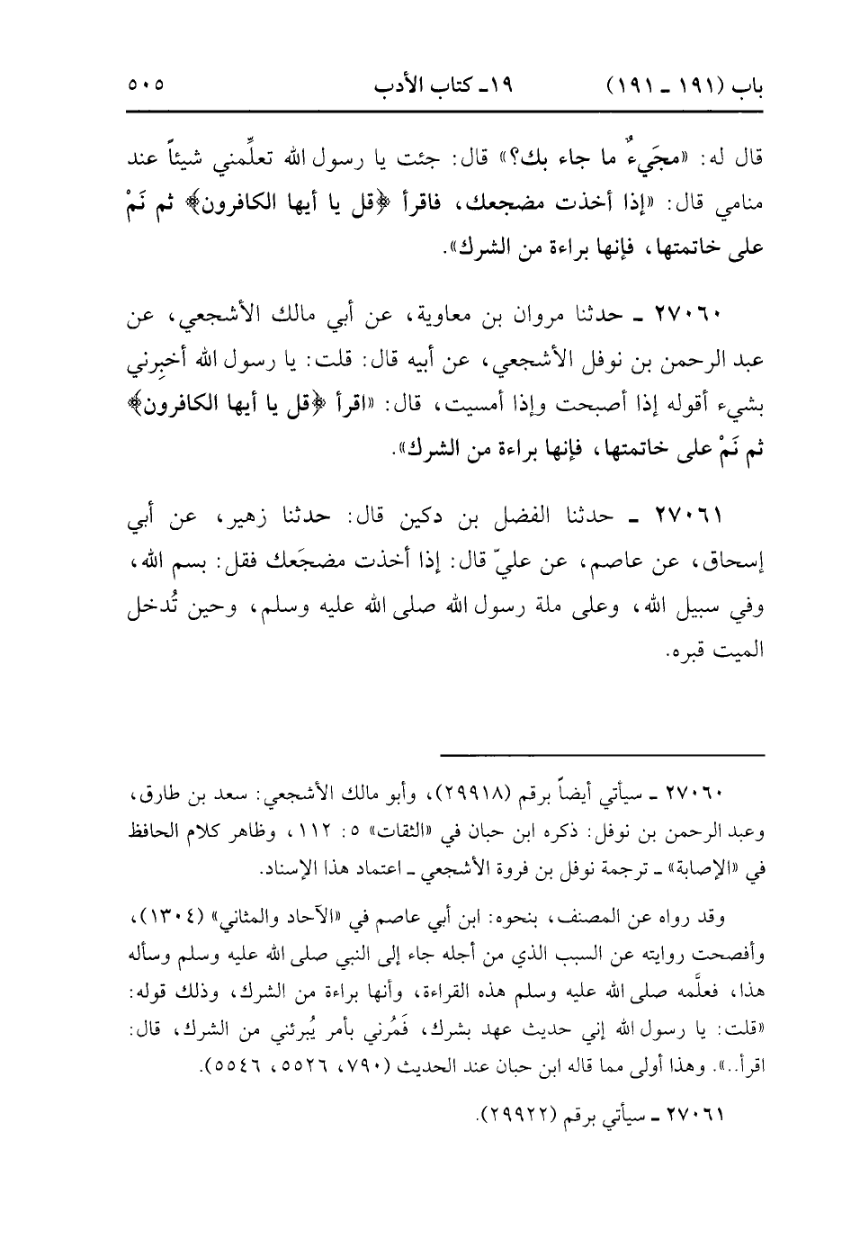 27060- حَدَّثَنَا مَرْوَانُ بْنُ مُعَاوِيَةَ ، عَنْ أَبِي مَالِكٍ الأَشْجَعِيِّ ، عَنْ عَبْدِ الرَّحْمَنِ بْنِ نَوْفَلٍ الأَشْجَعِيِّ ، عَنْ أَبِيهِ قَالَ : قُلْتُ : يَا رَسُولَ اللهِ ، أَخْبِرْنِي بِشَيْءٍ أَقُولُهُ إذَا أَصْبَحْتُ وَإِذَا أَمْسَيْتُ ؟ قَالَ : اقْرَأْ {قُلْ يَا أَيُّهَا الْكَافِرُونَ} ثُمَّ نَمْ عَلَى خَاتِمَتِهَا فَإِنَّهَا بَرَاءَةٌ مِنَ الشِّرْكِ.