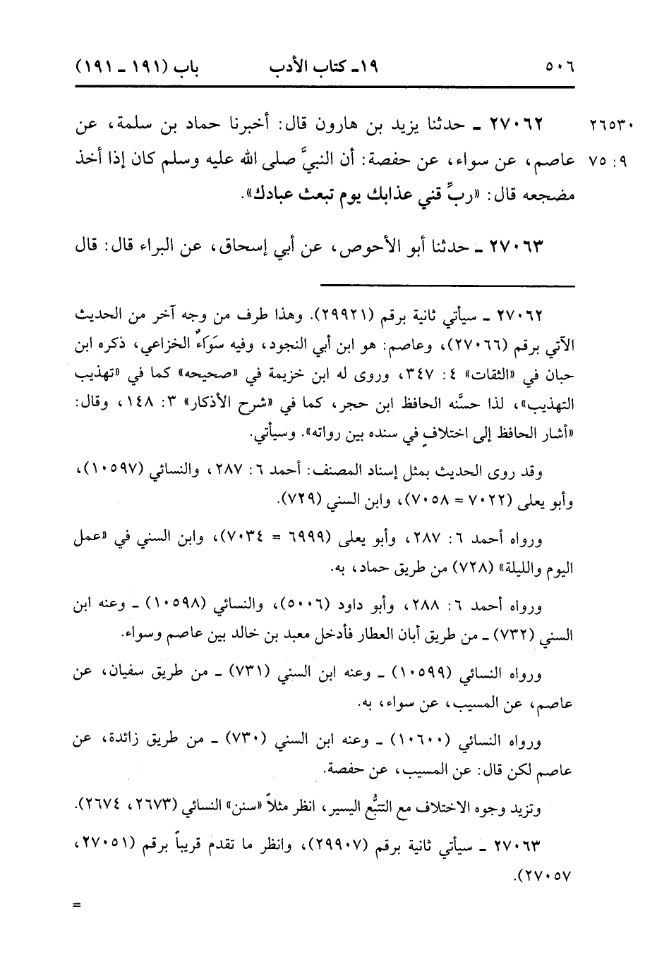 27062- حَدَّثَنَا يَزِيدُ بْنُ هَارُونَ , قَالَ : أَخْبَرَنَا حَمَّادُ بْنُ سَلَمَةَ ، عَنْ عَاصِمٍ ، عَنْ سَوَاءٍ ، عَنْ حَفْصَةَ ، أَنَّ النَّبِيَّ صَلَّى الله عَلَيْهِ وَسَلَّمَ كَانَ إذَا أَخَذَ مَضْجَعَهُ قَالَ : رَبِّ قِنِي عَذَابَك يَوْمَ تَبْعَثُ عِبَادَك. (9/74).