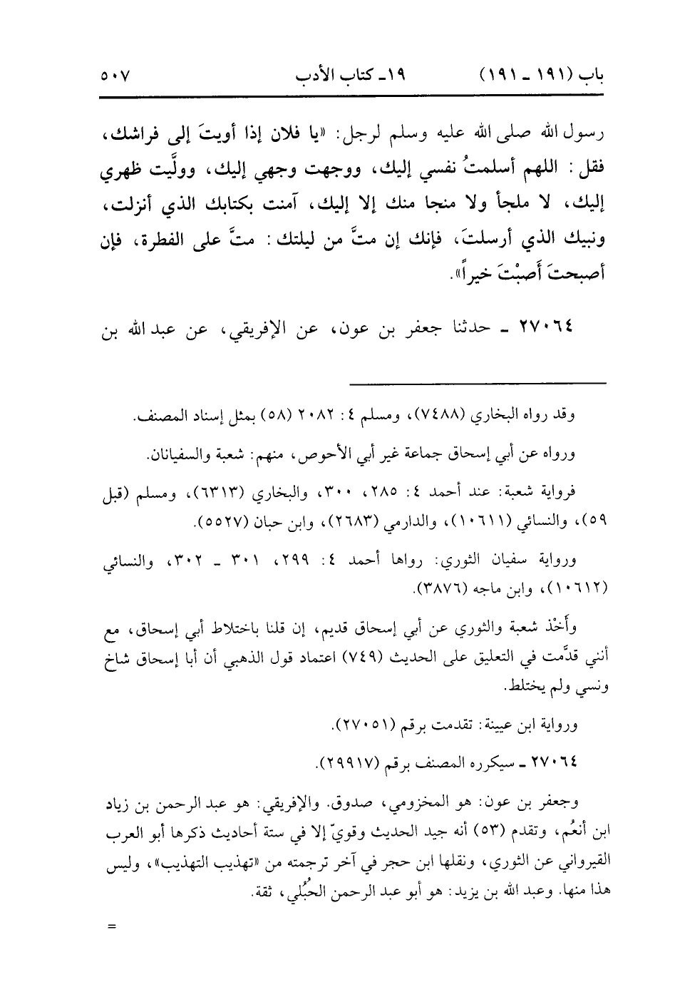 27064- حَدَّثَنَا جَعْفَرُ بْنُ عَوْنٍ ، عَنِ الإِفْرِيقِيِّ ، عَنْ عَبْدِ اللهِ بْنِ يَزِيدَ ، عَنْ عَبْدِ اللهِ بْنِ عَمْرٍو ، أَنَّ النَّبِيَّ صَلَّى الله عَلَيْهِ وَسَلَّمَ قَالَ لِرَجُلٍ مِنَ الأَنْصَارِ : كَيْفَ تَقُولُ حِينَ تُرِيدُ أَنْ تَنَامَ ؟ قَالَ : أَقُولُ بِاسْمِكَ وَضَعْت جَنْبِي فَاغْفِرْ لِي قَالَ : قَدْ غُفِرَ لَكَ. (9/75).