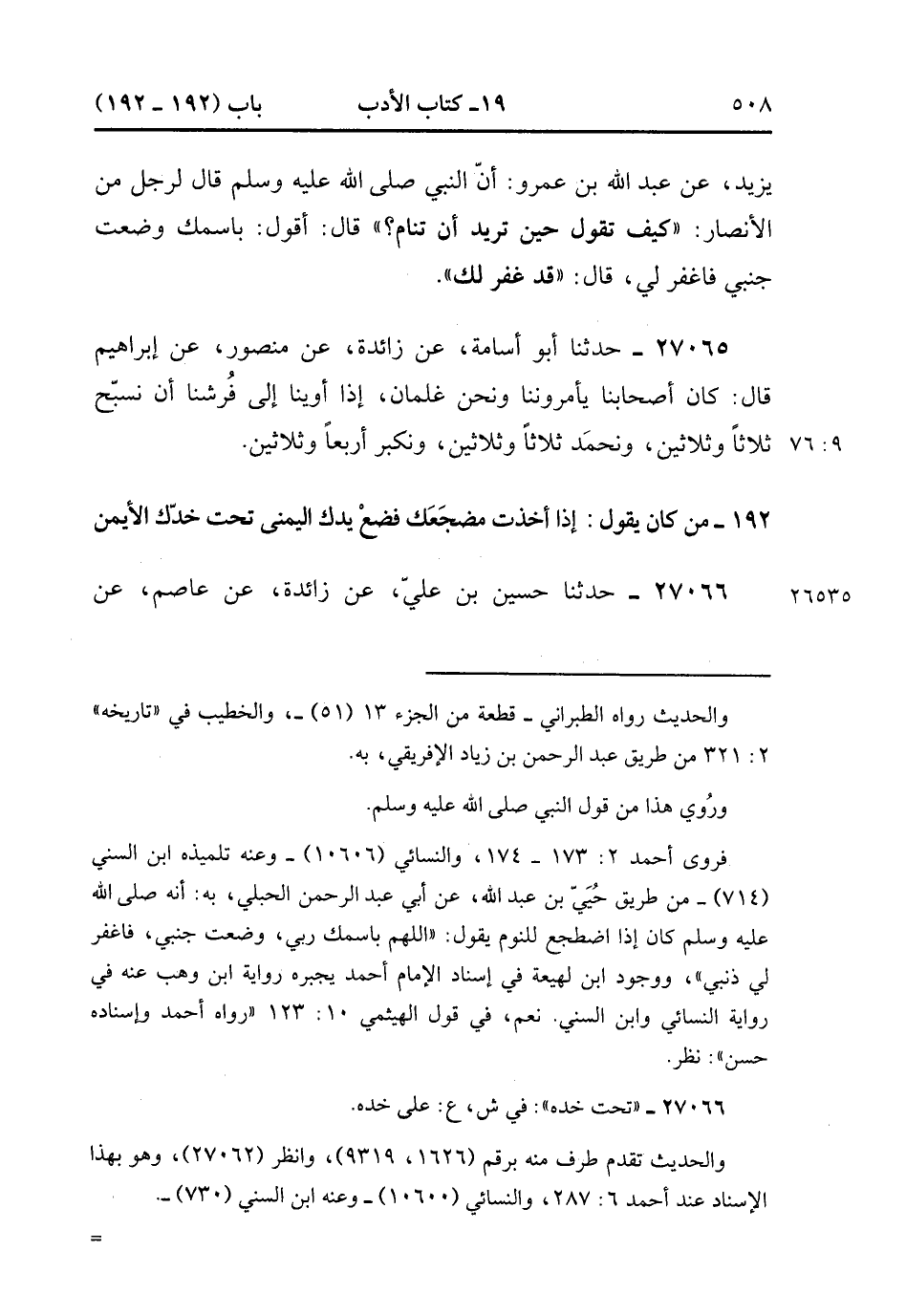 192- مَنْ كَانَ يقول : إذا أخذت مضجعك فضع يدك اليمنى تحت خدِّكَ الأيمنِ.