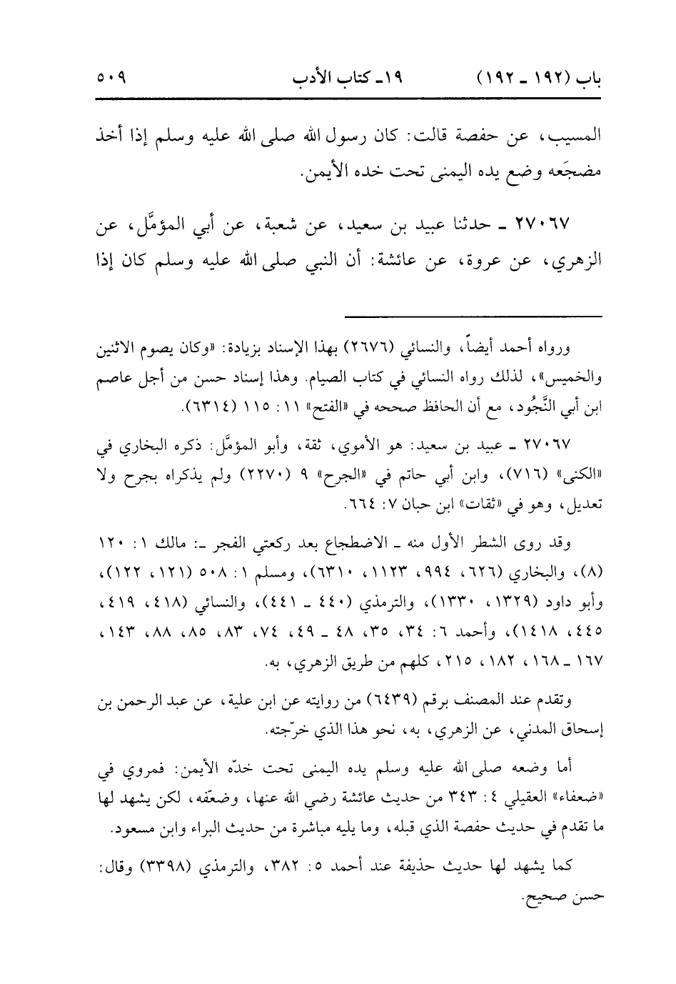 27067- حَدَّثَنَا عُبَيْدُ بْنُ سَعِيدٍ ، عَنْ شُعْبَةَ ، عَنْ أَبِي المُؤَمِّلِ ، عَنِ الزُّهْرِيِّ ، عَنْ عُرْوَةَ ، عَنْ عَائِشَةَ ، أَنَّ النَّبِيَّ صَلَّى الله عَلَيْهِ وَسَلَّمَ كَانَ إذَا صَلَّى رَكْعَتَيِ الْفَجْرِ اضْطَجَعَ وَوَضَعَ يَدَهُ الْيُمْنَى تَحْتَ خَدِّهِ الأَيْمَنِ. (9/76).
