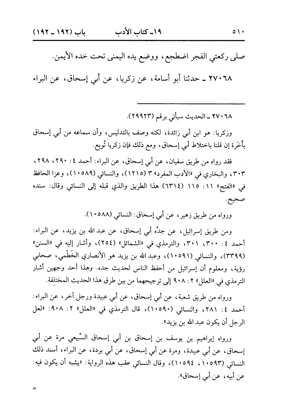 27068- حَدَّثَنَا أَبُو أُسَامَةَ ، عَنْ زَكَرِيَّا ، عَنْ أَبِي إِسْحَاقَ ، عَنِ الْبَرَاءِ قَالَ : كَانَ النَّبِيُّ صَلَّى الله عَلَيْهِ وَسَلَّمَ إذَا نَامَ تَوَسَّدَ يَمِينَهُ تَحْتَ خَدِّهِ وَيَقُولُ : قِنِي عَذَابَك يَوْمَ تَبْعَثُ عِبَادَكَ. (9/76).