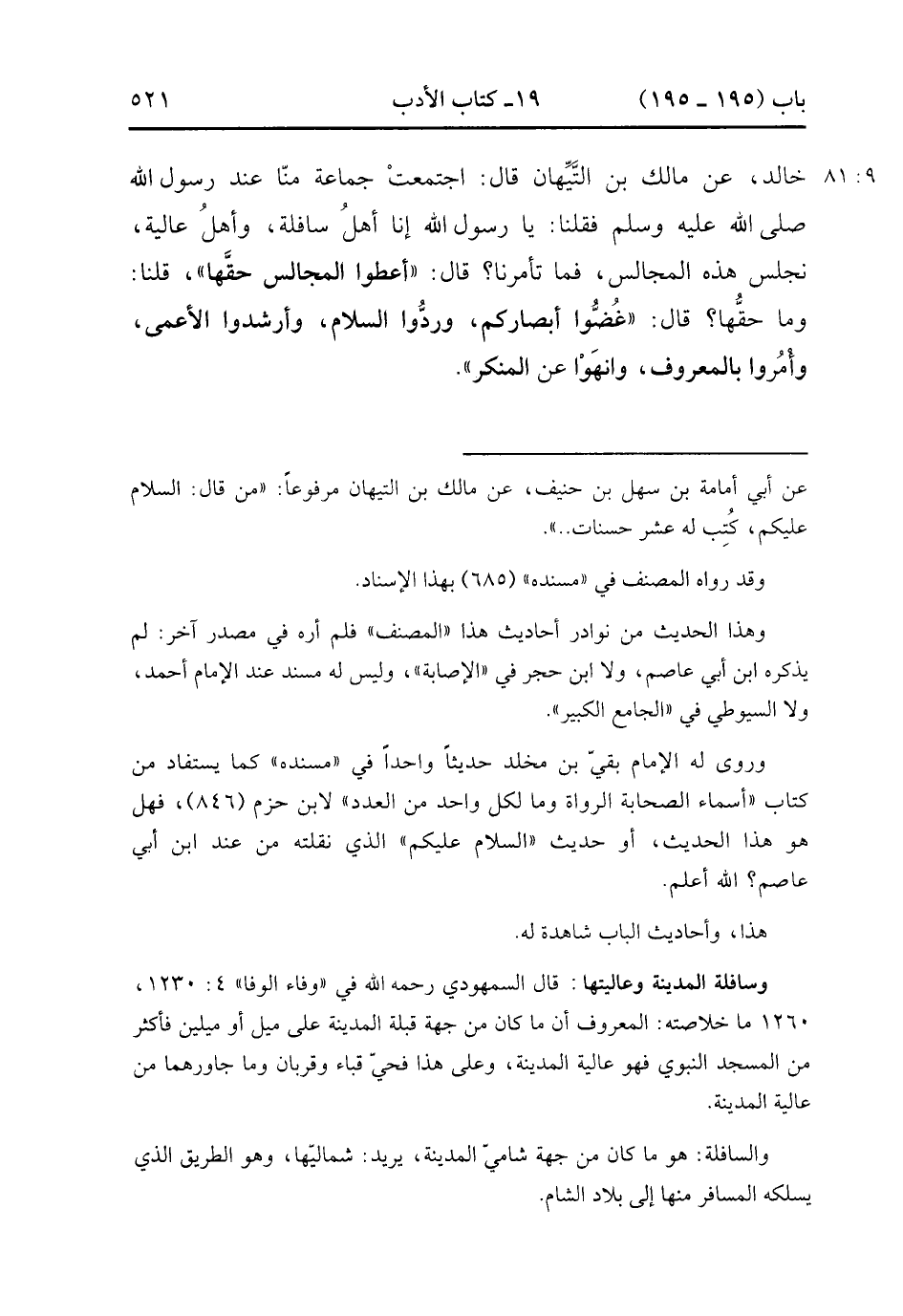 27081- حَدَّثَنَا ابْنُ نُمَيْرٍ , قَالَ : حدَّثَنَا مُوسَى بْنُ عُبَيْدَة ، عَنْ أَيُّوبَ بْنِ خَالِدٍ ، عَنْ مَالِكِ بْنِ التَّيْهَانِ قَالَ : اجْتَمَعَتْ جَمَاعَةٌ مِنَّا عِنْدَ رَسُولِ اللهِ صَلَّى الله عَلَيْهِ وَسَلَّمَ فَقُلْنَا : يَا رَسُولَ اللهِ ، إنَّا أَهْلُ سَافِلَةٍ وَأَهْلُ عَالِيَةٍ ، نَجْلِسُ هَذِهِ الْمَجَالِسَ فَمَا تَأْمُرُنَا ؟ قَالَ : أَعْطُوا الْمَجَالِسَ حَقَّهَا ، قُلْنَا وَمَا حَقهَا : قَالَ : غُضُّوا أَبْصَارَكُمْ , وَرُدُّوا السَّلاَمَ , وَأَرْشِدُوا الأَعْمَى , وَأْمُرُوا بِالْمَعْرُوفِ , وَانْهَوْا عَنِ الْمُنْكَرِ. (9/80).