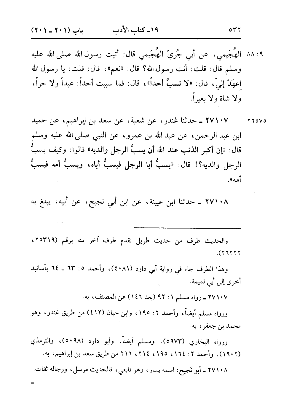 27107- حَدَّثَنَا غُنْدَرٌ ، عَنْ شُعْبَةَ ، عَنْ سَعْدِ بْنِ إبْرَاهِيمَ ، عَنْ حُمَيْدِ بْنِ عَبْدِ الرَّحْمَنِ ، عَنْ عبْدِ اللهِ بْنِ عَمْرٍو ، عَنِ النَّبِيِّ صَلَّى الله عَلَيْهِ وَسَلَّمَ قَالَ : إنَّ أَكْبَرَ الذَّنْبِ عِنْدَ اللهِ أَنْ يَسُبَّ الرَّجُلُ وَالِدَيْهِ ، قَالُوا : وَكَيْفَ يَسُبُّ الرَّجُلُ وَالِدَيْهِ ؟ قَالَ : يَسُبُّ أَبَا الرَّجُلِ فَيَسُبُّ أَبَاهُ ، وَيَسُبُّ أُمَّهُ فَيَسُبُّ أُمَّهُ. (9/88).