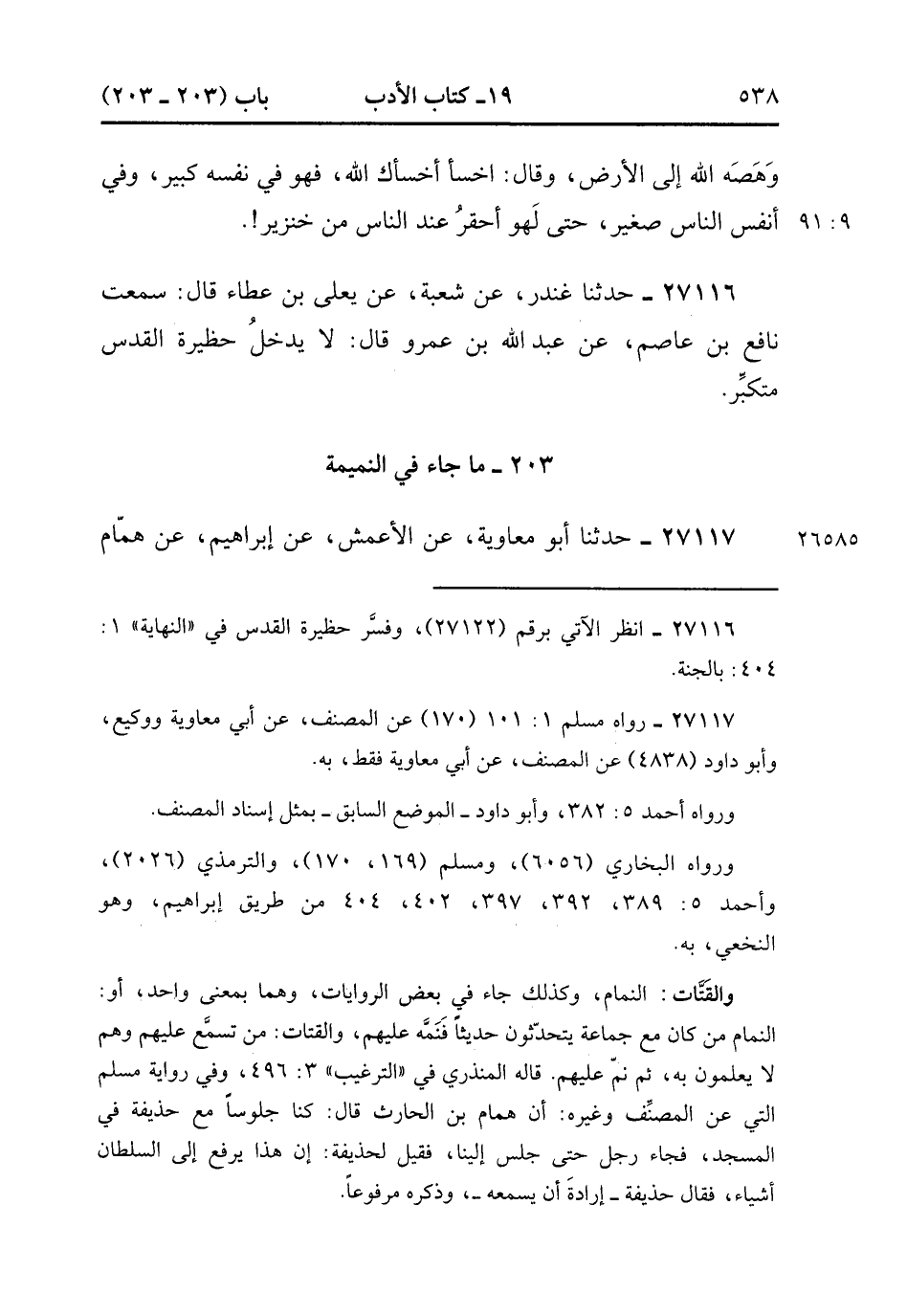 27117- حَدَّثَنَا أَبُو مُعَاوِيَةَ ، عَنِ الأَعْمَشِ ، عَنْ إبْرَاهِيمَ ، عَنْ هَمَّامِ بْنِ الْحَارِثِ ، عَنْ حُذَيْفَةَ قَالَ : قَالَ رَسُولُ اللهِ صَلَّى الله عَلَيْهِ وَسَلَّمَ : لاَ يَدْخُلُ الْجَنَّةَ قَتَّاتٌ. (9/91).
