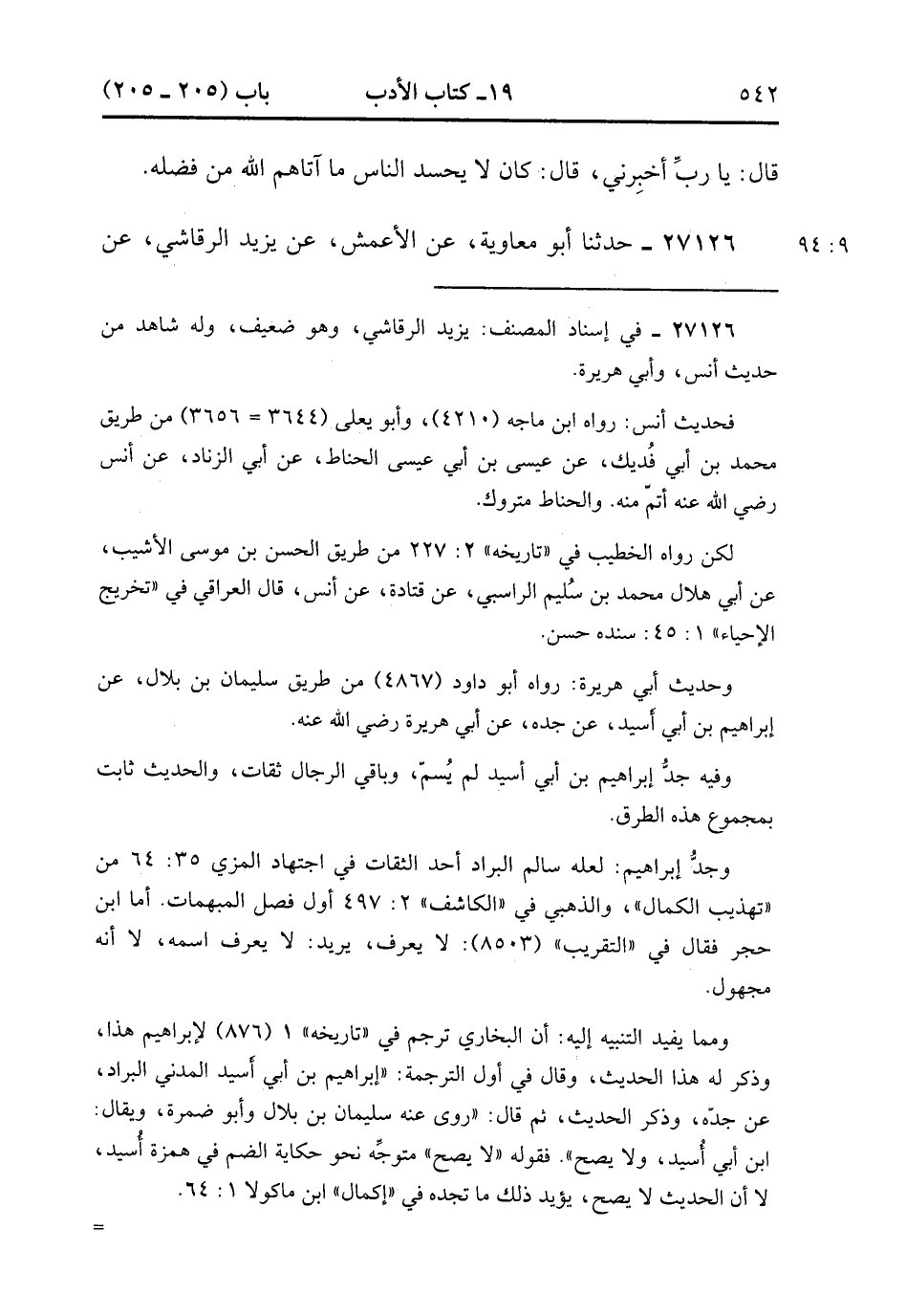 27126- حَدَّثَنَا أَبُو مُعَاوِيَةَ ، عَنِ الأَعْمَشِ ، عَنْ يَزِيدَ الرَّقَاشِيِّ ، عَنْ أَنَسٍ قَالَ : قَالَ رَسُولُ اللهِ صَلَّى الله عَلَيْهِ وَسَلَّمَ : إنَّ الْحَسَدَ لَيَأْكُلُ الْحَسَنَاتِ كَمَا تَأْكُلُ النَّارُ الْحَطَبَ. (9/93).