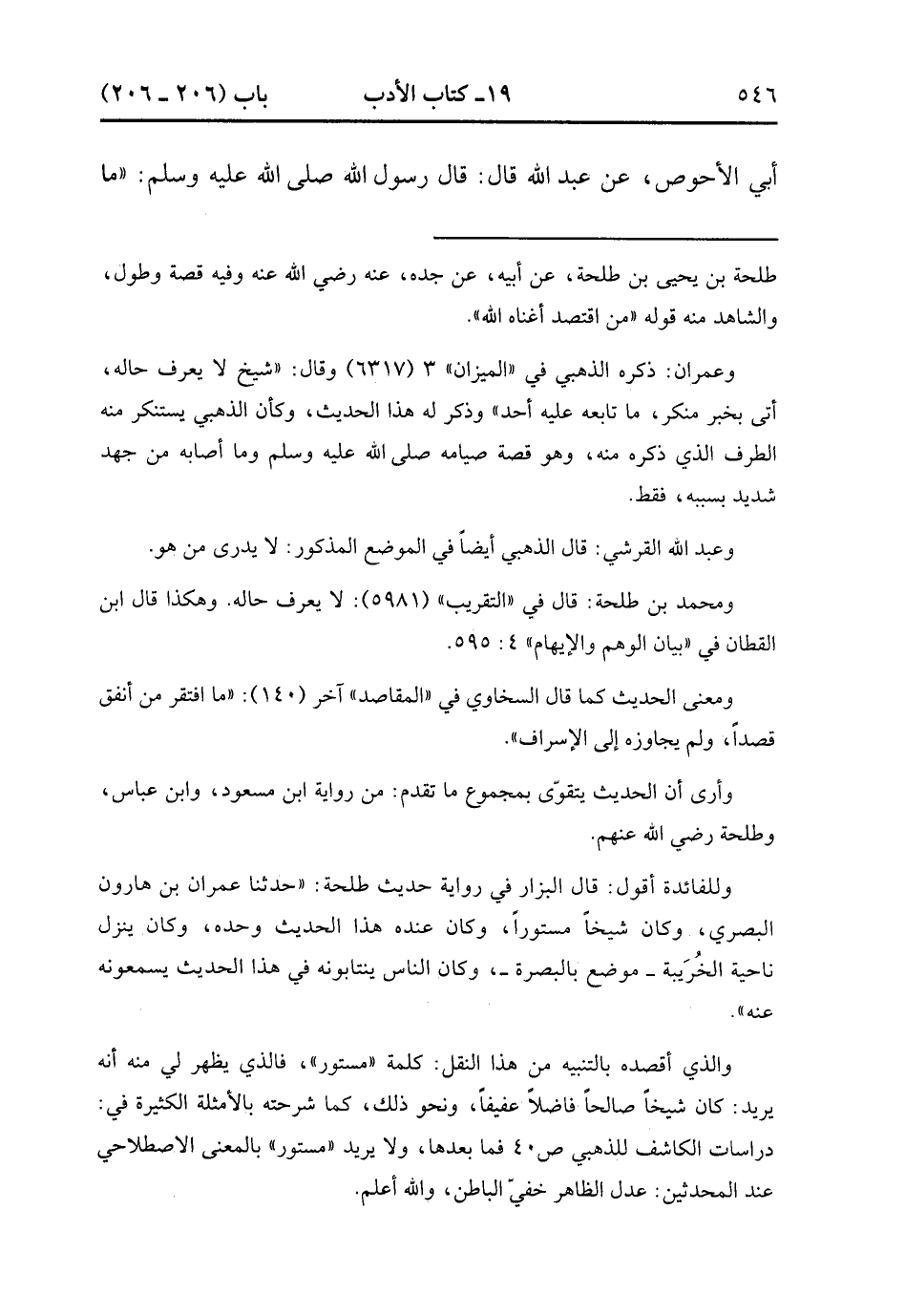27136- حَدَّثَنَا عَفَّانُ ، عَنْ سُكَيْنِ بْنِ عَبْدِ الْعَزِيزِ ، عَنِ الْهَجَرِيِّ ، عَنْ أَبِي الأَحْوَصِ ، عَنْ عَبْدِ اللهِ قَالَ : قَالَ رَسُولُ اللهِ صَلَّى الله عَلَيْهِ وَسَلَّمَ : مَا عَالَ مَنِ اقْتَصَدَ. (9/96).